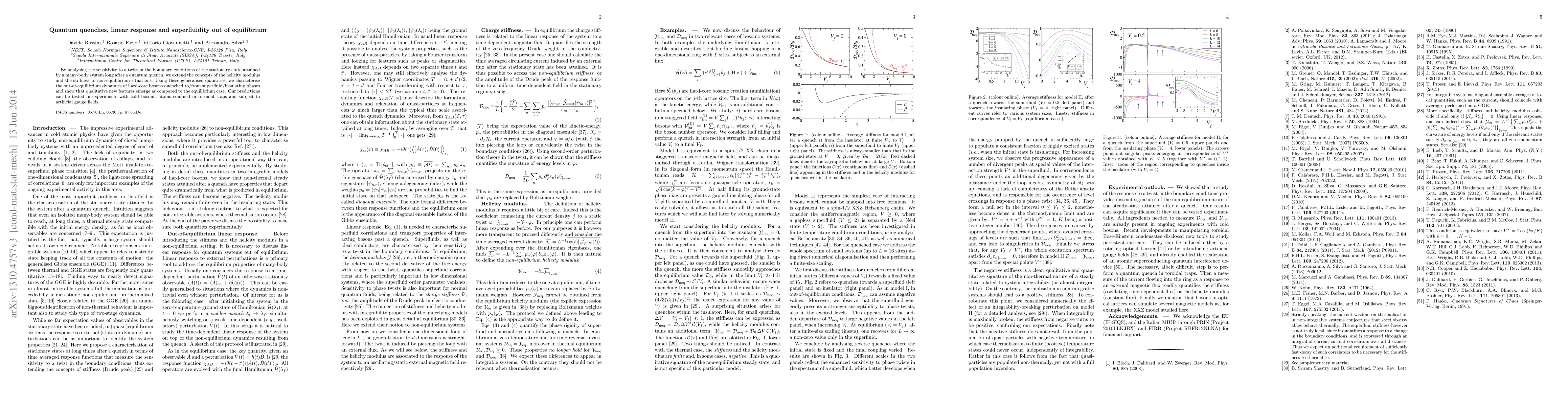 By analysing the sensitivity to a twist in the boundary conditions of the stationary state attained by a many-body system long after a quantum quench, we extend the concepts of the helicity modulus and the stiffness to non-equilibrium situations. Using these generalised quantities, we characterise the out-of-equilibrium dynamics of hard-core bosons quenched to/from superfluid/insulating phases and show that qualitative new features emerge as compared to the equilibrium case. Our predictions can be tested in experiments with cold bosonic atoms confined in toroidal traps and subject to artificial gauge fields.