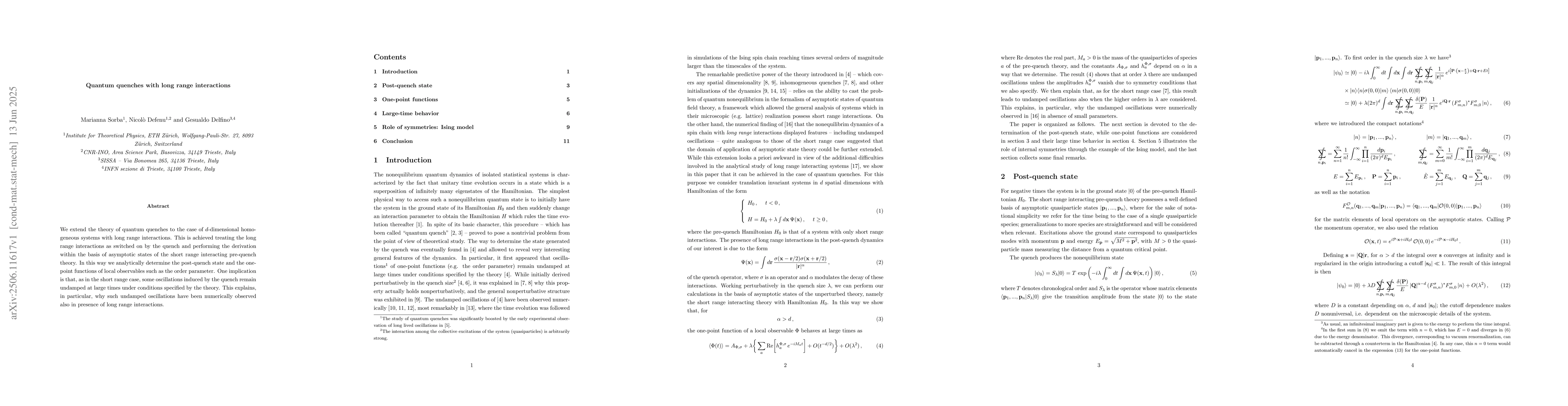 We extend the theory of quantum quenches to the case of $d$-dimensional homogeneous systems with long range interactions. This is achieved treating the long range interactions as switched on by the quench and performing the derivation within the basis of asymptotic states of the short range interacting pre-quench theory. In this way we analytically determine the post-quench state and the one-point functions of local observables such as the order parameter. One implication is that, as in the short range case, some oscillations induced by the quench remain undamped at large times under conditions specified by the theory. This explains, in particular, why such undamped oscillations have been numerically observed also in presence of long range interactions.