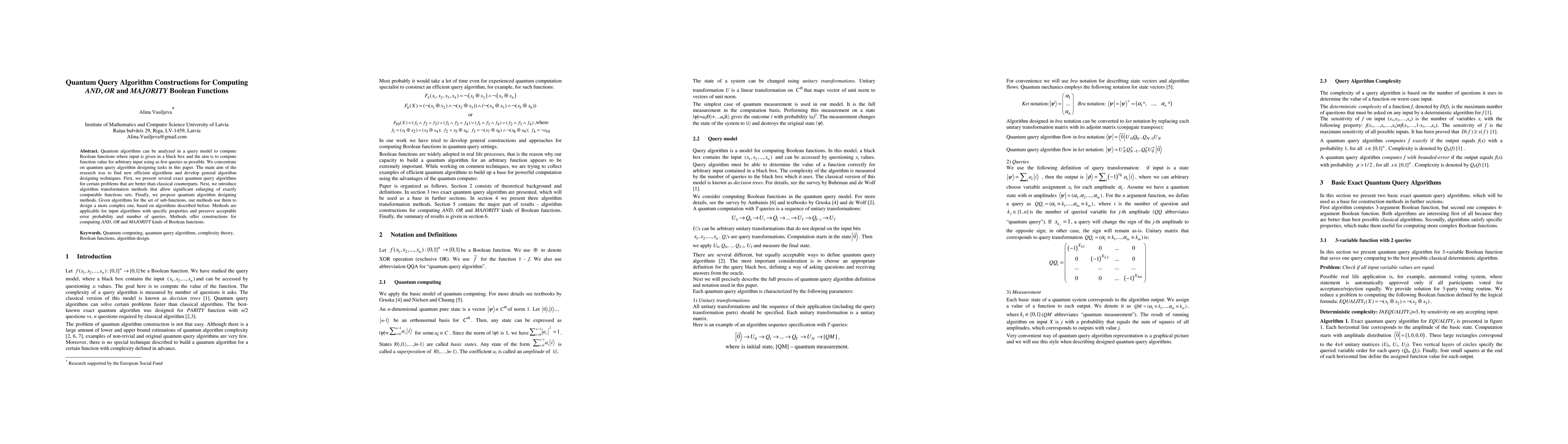 This paper develops efficient quantum query algorithms for computing AND, OR, and MAJORITY Boolean functions, outperforming classical methods. It introduces transformation techniques to expand the set of exactly computable functions and proposes general algorithm design methods for constructing complex algorithms from simpler ones.