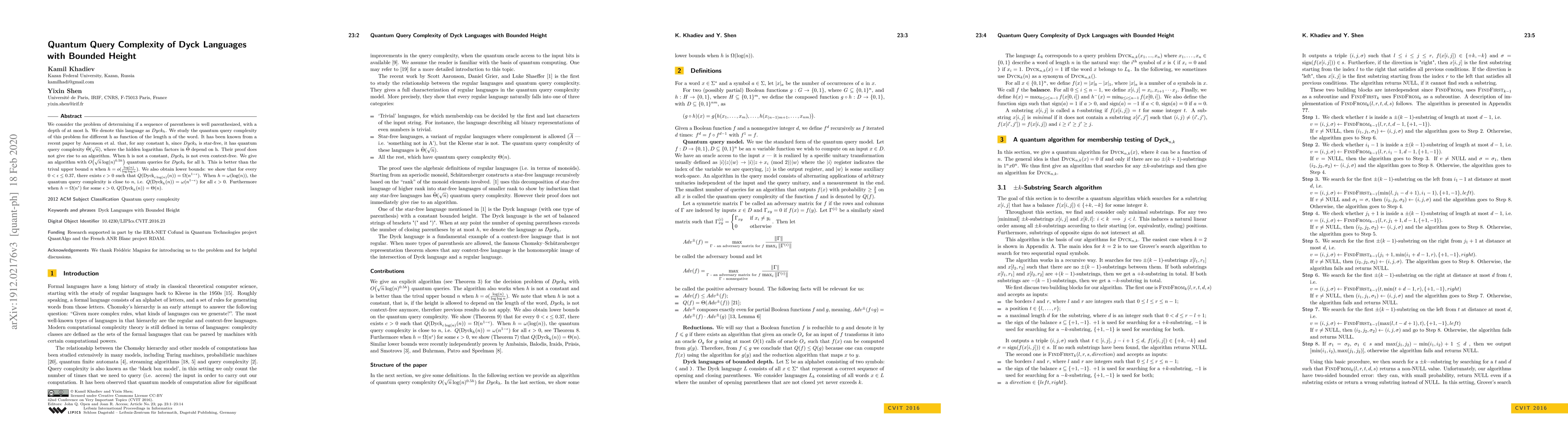 This paper analyzes the quantum query complexity of Dyck languages with bounded height (Dyck_h), finding that for non-constant h, it provides an algorithm with O(√n log(n)^(0.5h)) queries, outperforming the trivial n query upper bound when h=o(log(n)/log(log n)). Lower bounds are also established, showing that for 0<ε≤0.37, Q(Dyck_(c log(n))(n))=Ω(n^(1-ε)) for large enough c, and when h=ω(log(n)), the complexity approaches n. When h=Ω(n^ε) for ε>0, the complexity is Θ(n).