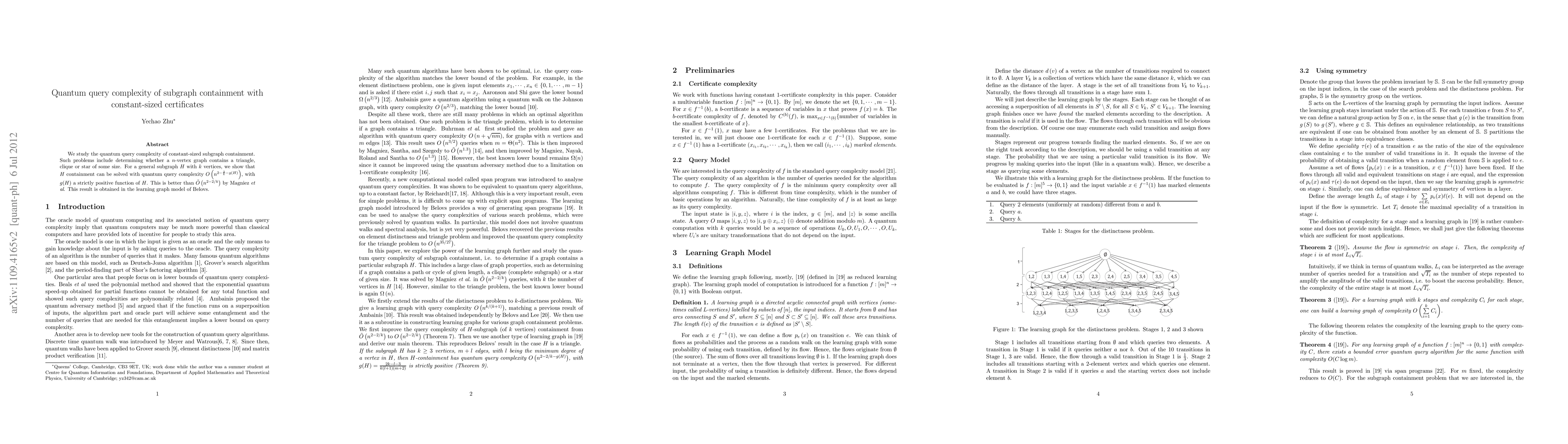 This paper investigates the quantum query complexity of determining if an $n$-vertex graph contains a subgraph $H$ with $k$ vertices, showing that it can be solved with complexity $O(n^{2-\frac{2}{k}-g(H)})$, improving upon previous results by Magniez et al. The findings are derived using the learning graph model of Belovs.