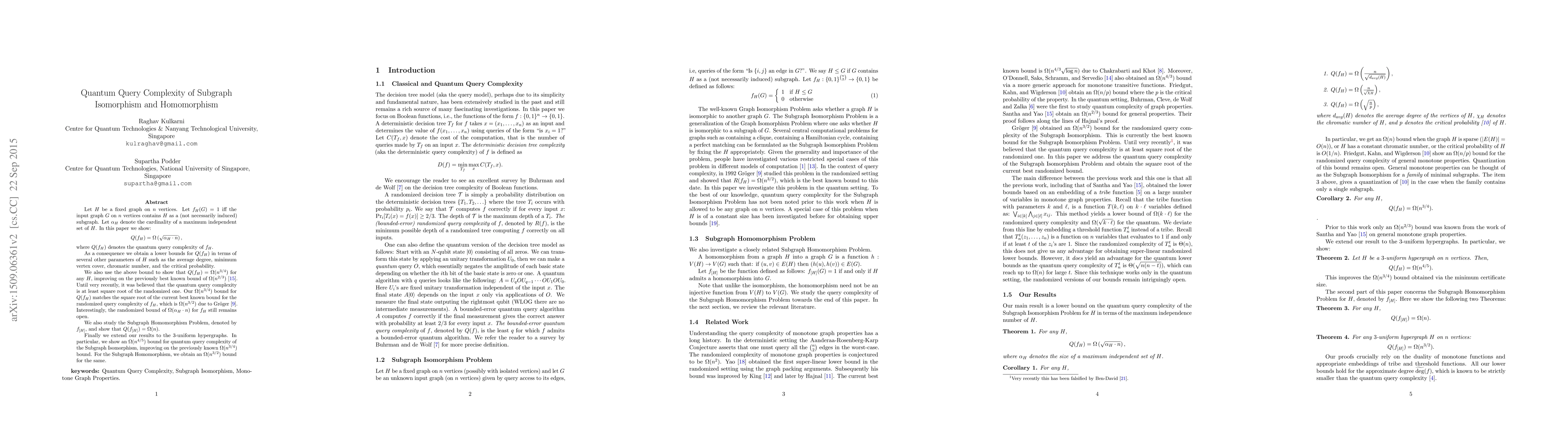 Let $H$ be a fixed graph on $n$ vertices. Let $f_H(G) = 1$ iff the input graph $G$ on $n$ vertices contains $H$ as a (not necessarily induced) subgraph. Let $\alpha_H$ denote the cardinality of a maximum independent set of $H$. In this paper we show: \[Q(f_H) = \Omega\left(\sqrt{\alpha_H \cdot n}\right),\] where $Q(f_H)$ denotes the quantum query complexity of $f_H$. As a consequence we obtain a lower bounds for $Q(f_H)$ in terms of several other parameters of $H$ such as the average degree, minimum vertex cover, chromatic number, and the critical probability. We also use the above bound to show that $Q(f_H) = \Omega(n^{3/4})$ for any $H$, improving on the previously best known bound of $\Omega(n^{2/3})$. Until very recently, it was believed that the quantum query complexity is at least square root of the randomized one. Our $\Omega(n^{3/4})$ bound for $Q(f_H)$ matches the square root of the current best known bound for the randomized query complexity of $f_H$, which is $\Omega(n^{3/2})$ due to Gr\"oger. Interestingly, the randomized bound of $\Omega(\alpha_H \cdot n)$ for $f_H$ still remains open. We also study the Subgraph Homomorphism Problem, denoted by $f_{[H]}$, and show that $Q(f_{[H]}) = \Omega(n)$. Finally we extend our results to the $3$-uniform hypergraphs. In particular, we show an $\Omega(n^{4/5})$ bound for quantum query complexity of the Subgraph Isomorphism, improving on the previously known $\Omega(n^{3/4})$ bound. For the Subgraph Homomorphism, we obtain an $\Omega(n^{3/2})$ bound for the same.
