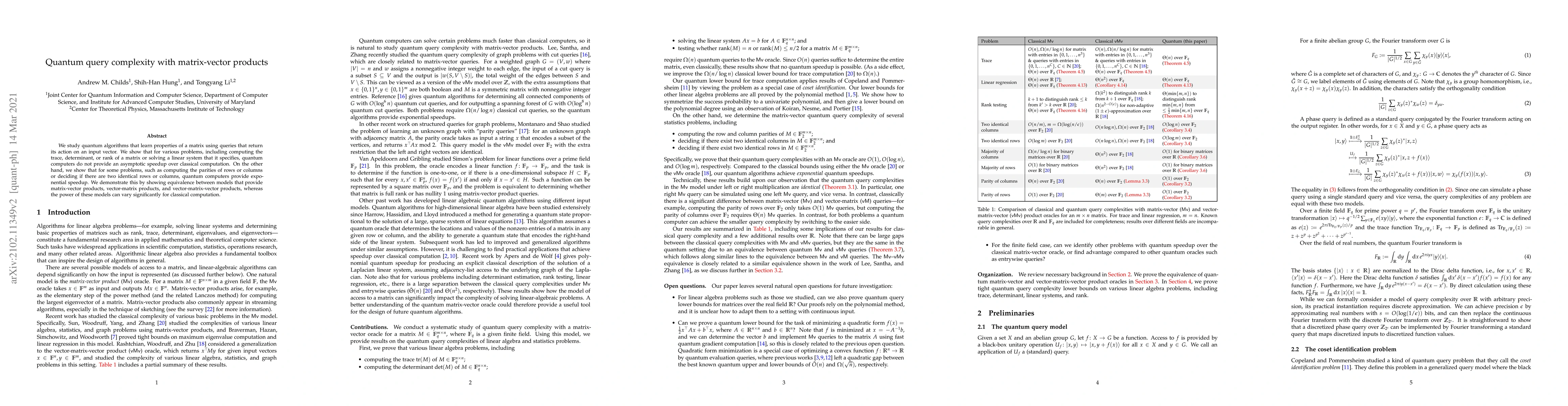 This paper investigates quantum query complexity for matrix-vector product operations, finding no asymptotic speedup for tasks like computing trace, determinant, or rank, but demonstrating exponential speedup for problems like computing row or column parities and detecting identical rows or columns. It highlights the varying power of matrix-vector product models between classical and quantum computation.