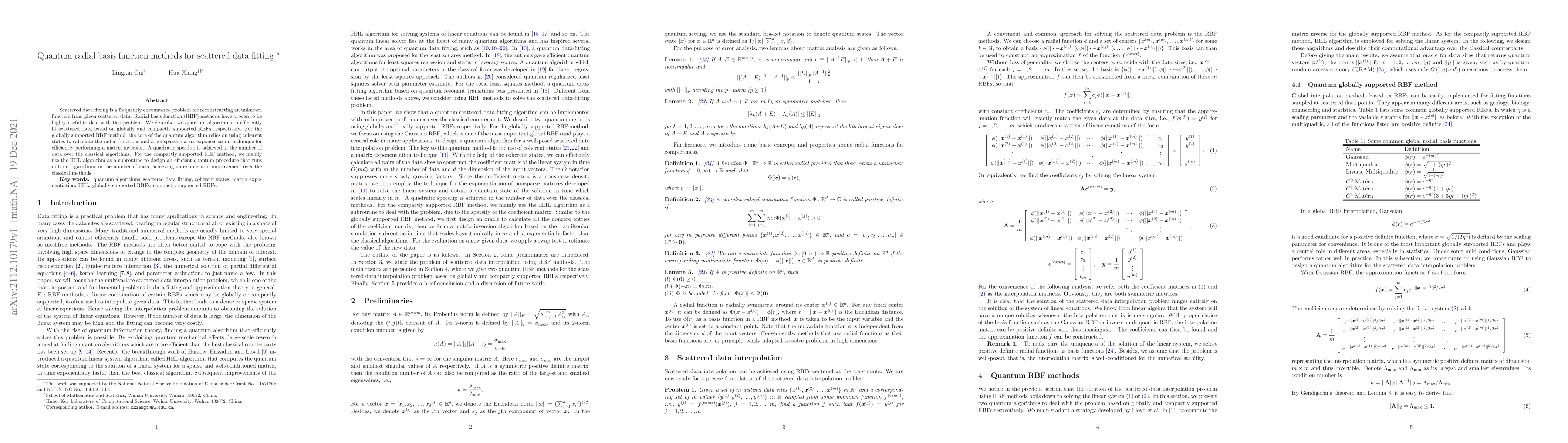 This paper proposes two quantum algorithms for scattered data fitting using radial basis functions (RBFs). The first algorithm uses coherent states and matrix exponentiation for globally supported RBFs, achieving a quadratic speedup over classical methods. The second algorithm leverages the HHL algorithm for compactly supported RBFs, achieving an exponential improvement in time complexity.