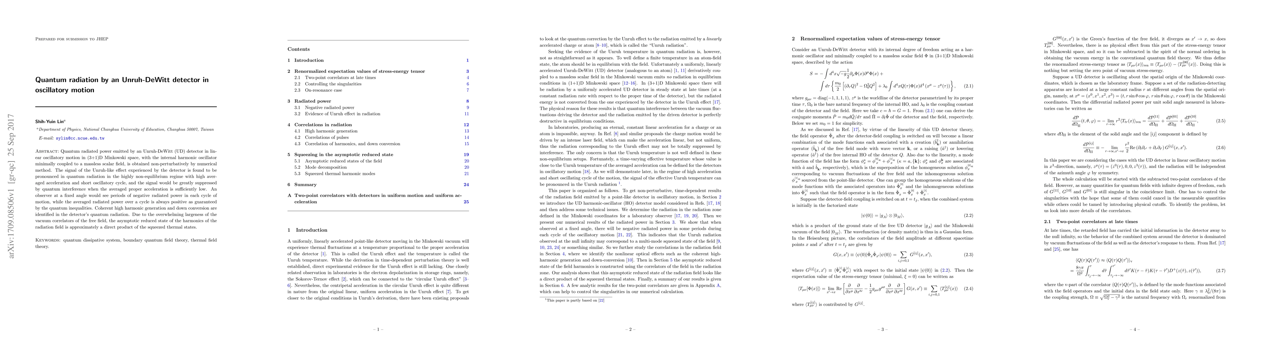 Quantum radiated power emitted by an Unruh-DeWitt (UD) detector in linear oscillatory motion in (3+1)D Minkowski space, with the internal harmonic oscillator minimally coupled to a massless scalar field, is obtained non-perturbatively by numerical method. The signal of the Unruh-like effect experienced by the detector is found to be pronounced in quantum radiation in the highly non-equilibrium regime with high averaged acceleration and short oscillatory cycle, and the signal would be greatly suppressed by quantum interference when the averaged proper acceleration is sufficiently low. An observer at a fixed angle would see periods of negative radiated power in each cycle of motion, while the averaged radiated power over a cycle is always positive as guaranteed by the quantum inequalities. Coherent high harmonic generation and down conversion are identified in the detector's quantum radiation. Due to the overwhelming largeness of the vacuum correlators of the free field, the asymptotic reduced state of the harmonics of the radiation field is approximately a direct product of the squeezed thermal states.
