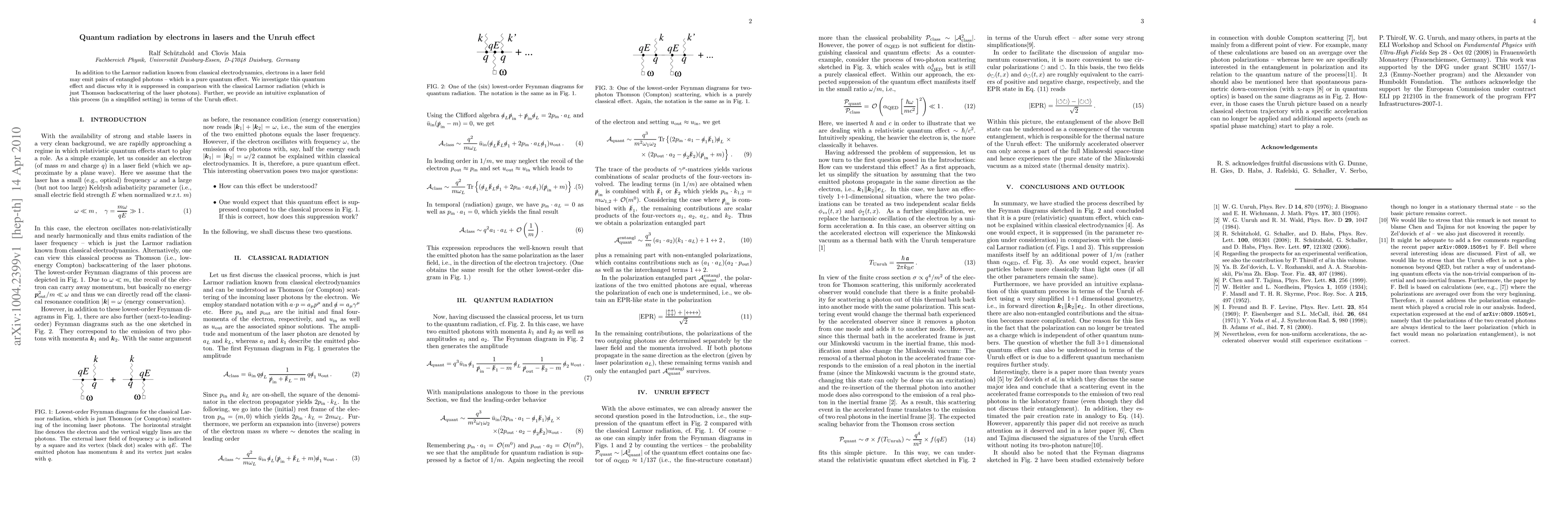 This paper explores quantum radiation from electrons in laser fields, revealing the emission of entangled photon pairs—a phenomenon distinct from classical Larmor radiation. It explains the suppression of this quantum effect relative to classical radiation and offers an intuitive connection to the Unruh effect.