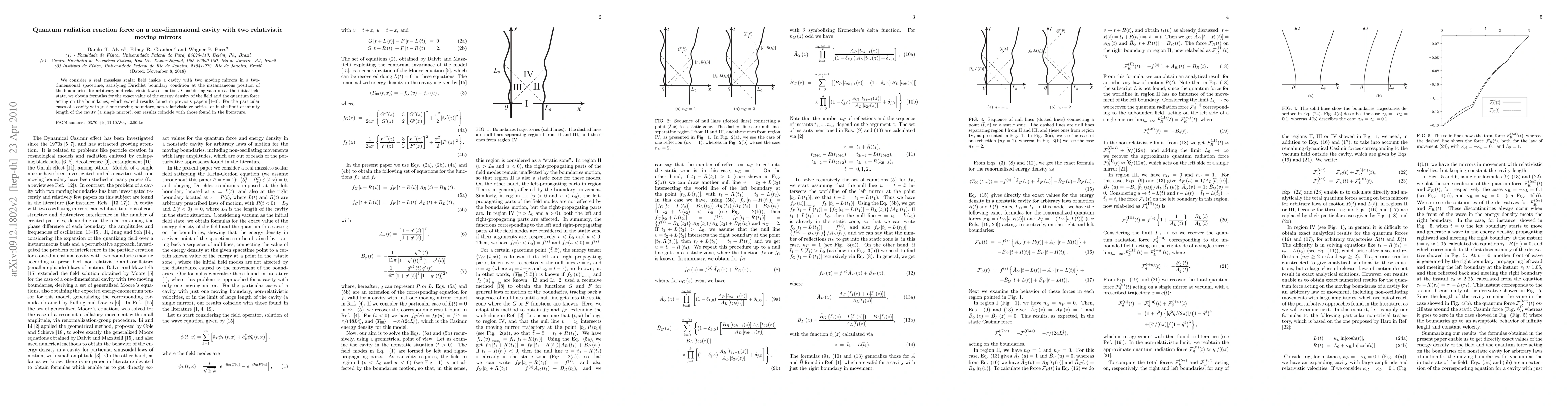 We consider a real massless scalar field inside a cavity with two moving mirrors in a two-dimensional spacetime, satisfying Dirichlet boundary condition at the instantaneous position of the boundaries, for arbitrary and relativistic laws of motion. Considering vacuum as the initial field state, we obtain formulas for the exact value of the energy density of the field and the quantum force acting on the boundaries, which extend results found in previous papers. For the particular cases of a cavity with just one moving boundary, non-relativistic velocities, or in the limit of infinity length of the cavity (a single mirror), our results coincide with those found in the literature.
