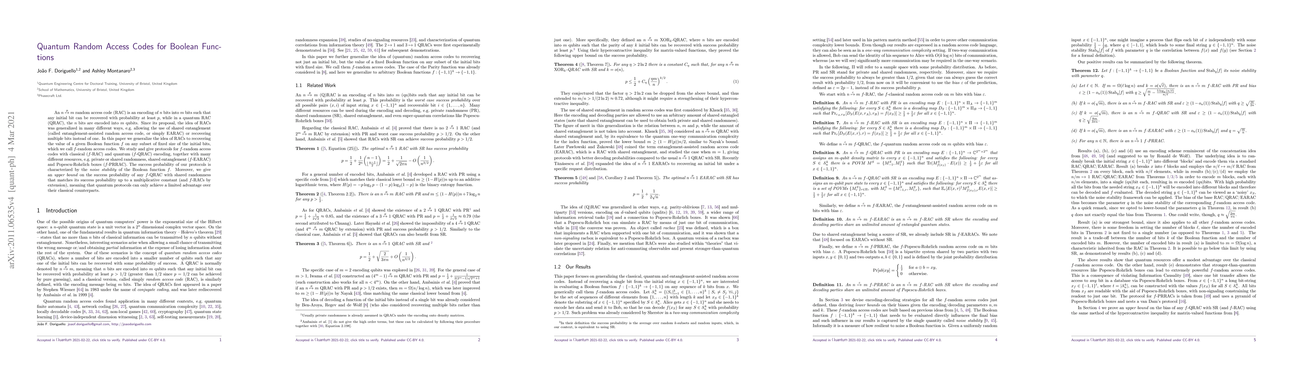 The paper introduces f-random access codes (f-RACs) and f-quantum random access codes (f-QRACs) for Boolean functions, providing protocols and lower and upper bounds for their success probabilities and biases using various resources.
