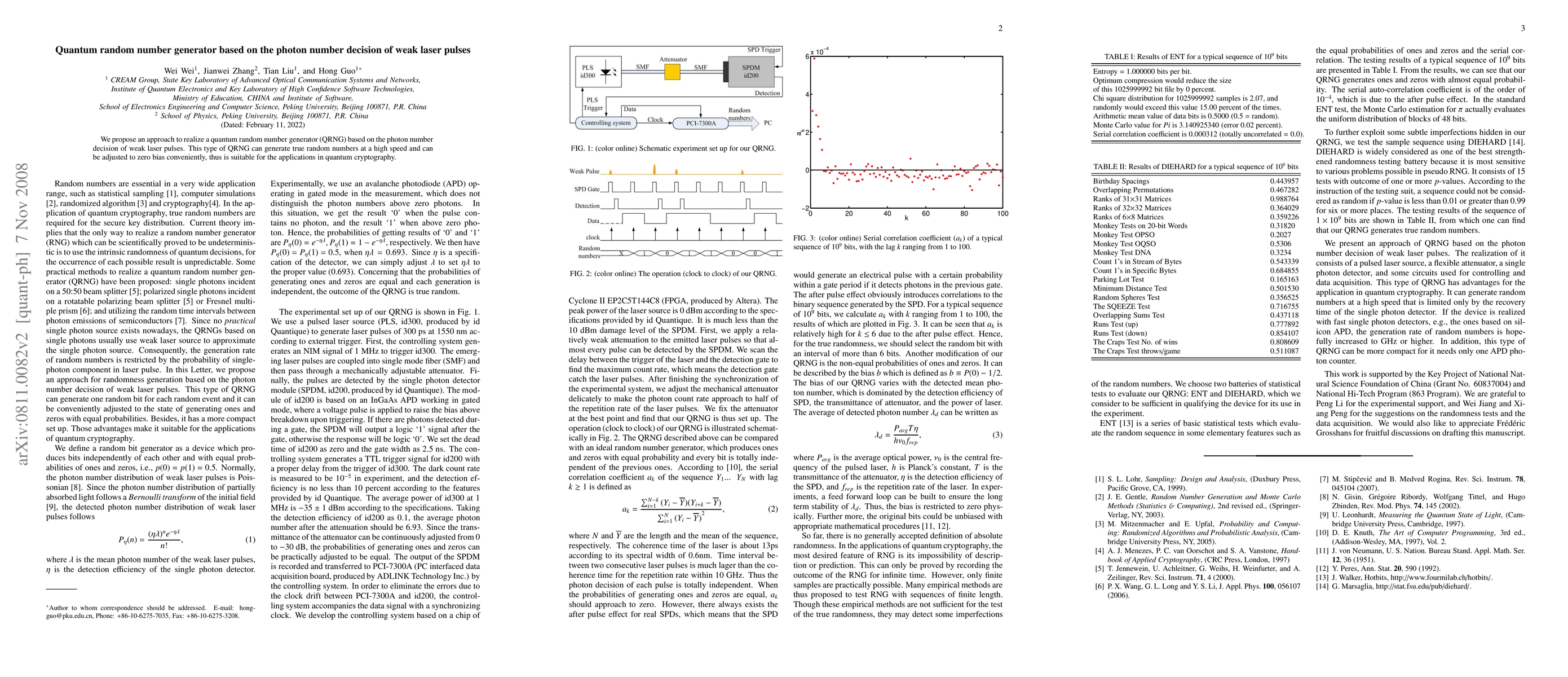 Summary: This paper proposes a quantum random number generator (QRNG) based on the photon number decision of weak laser pulses, capable of generating high-speed, true random numbers with minimal bias, suitable for quantum cryptography applications.