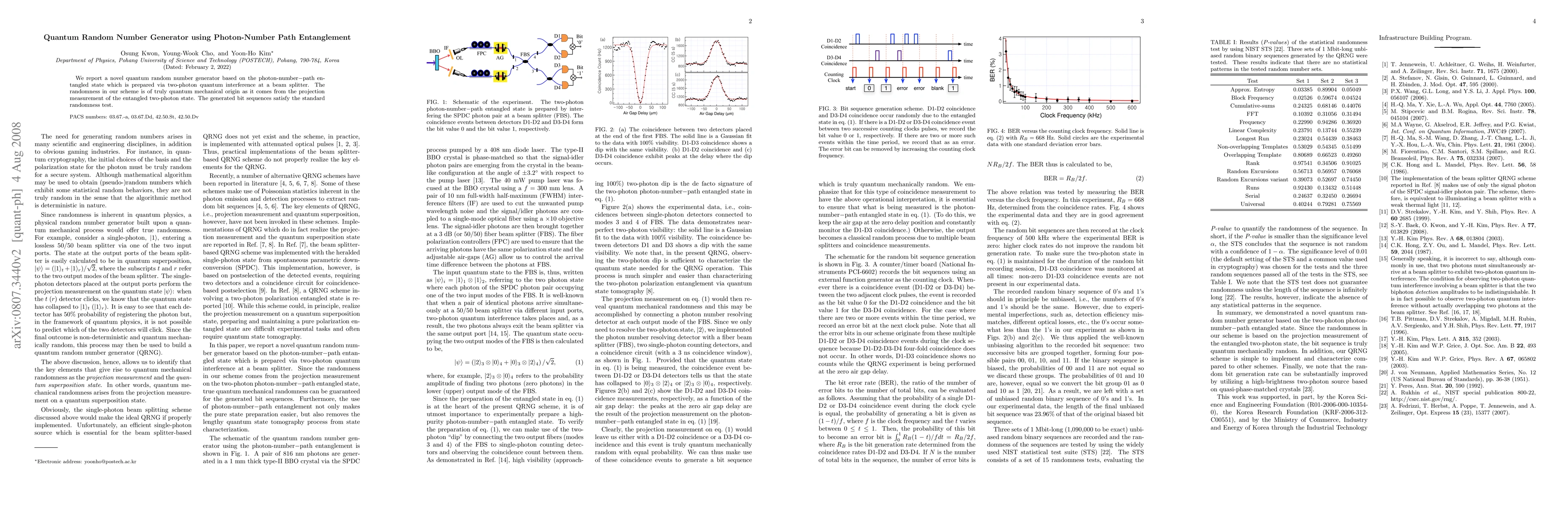 This paper introduces a quantum random number generator utilizing photon-number path entanglement, achieved through two-photon interference at a beam splitter. The randomness originates from quantum mechanical projection measurements, producing bit sequences that pass standard randomness tests.