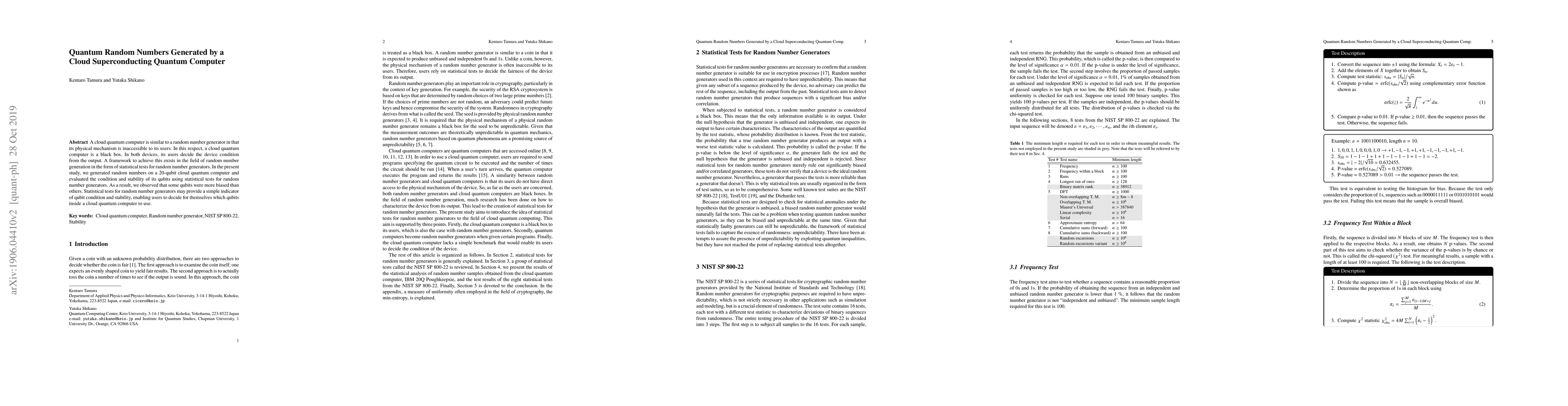 This study utilized a 20-qubit cloud quantum computer to generate random numbers, applying statistical tests for random number generators to assess qubit condition and stability. The findings indicate that certain qubits exhibited more bias, suggesting these tests could serve as a simple indicator for users to choose suitable qubits in a cloud quantum computer.