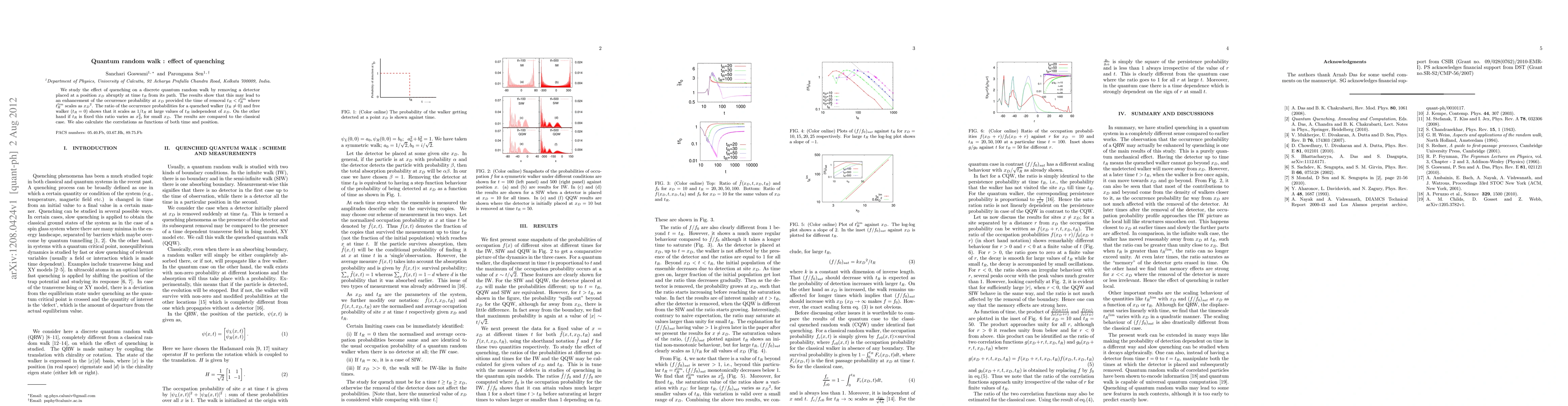 This research investigates the impact of suddenly removing a detector (quenching) from a quantum random walk's path at time t_R on the probability of detection at position x_D. Results indicate an enhanced detection probability at x_D when t_R is less than a critical time scaling with x_D squared. The occurrence probability ratio for quenched vs. free walkers scales as 1/t_R for large t_R, but as x_D squared for small x_D when t_R is fixed. The study also explores correlations as functions of time and position, contrasting with classical walk cases.
