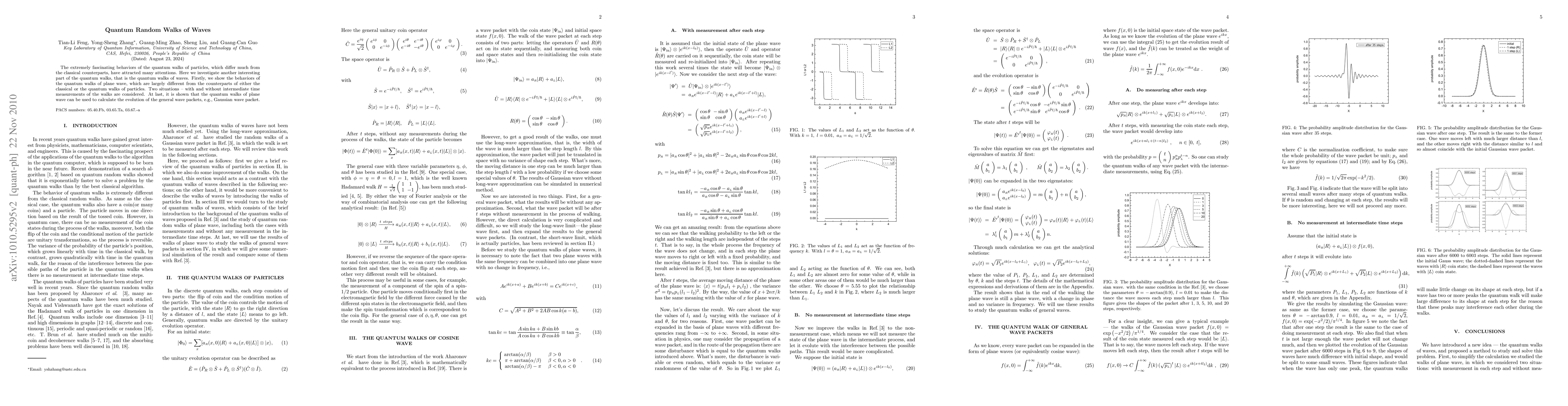 The extremely fascinating behaviors of the quantum walks of particles, which differ much from the classical counterparts, have attracted many physicists. Here we investigate another interesting part of the quantum walks, that is the quantum walks of waves. Firstly, we show the behaviors of the quantum walks of plane wave, which are largely different from the counterparts of either the classical or the quantum walks of particles. Two situations - with and without intermediate time measurements of the walks are considered. At last, it is shown that the quantum walks of plane wave can be used to calculate the evolution of the general wave packets, e.g., Gaussian wave packet.