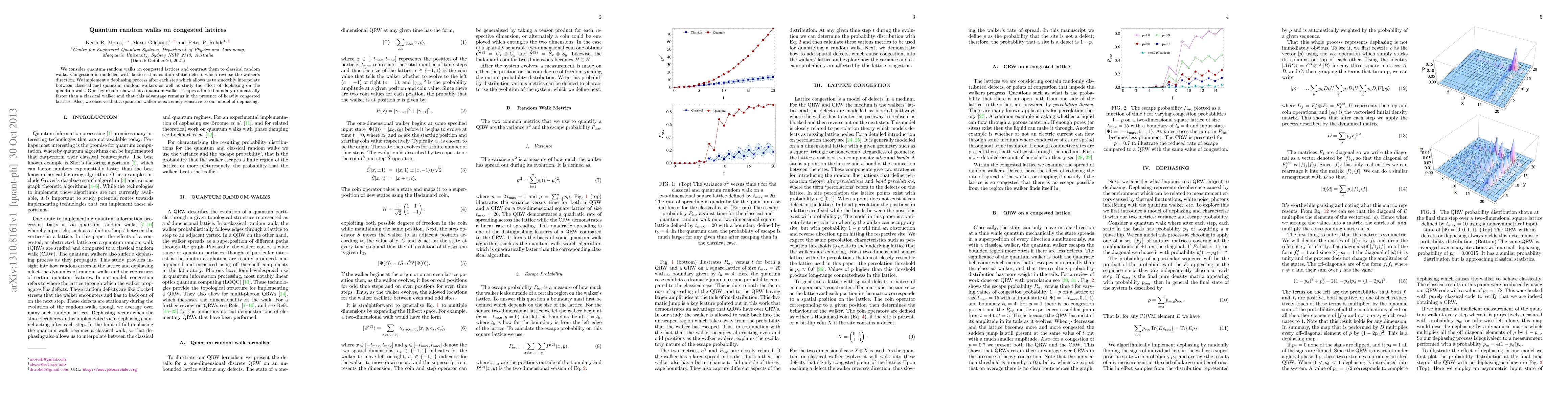 We consider quantum random walks on congested lattices and contrast them to classical random walks. Congestion is modelled with lattices that contain static defects which reverse the walker's direction. We implement a dephasing process after each step which allows us to smoothly interpolate between classical and quantum random walkers as well as study the effect of dephasing on the quantum walk. Our key results show that a quantum walker escapes a finite boundary dramatically faster than a classical walker and that this advantage remains in the presence of heavily congested lattices. Also, we observe that a quantum walker is extremely sensitive to our model of dephasing.