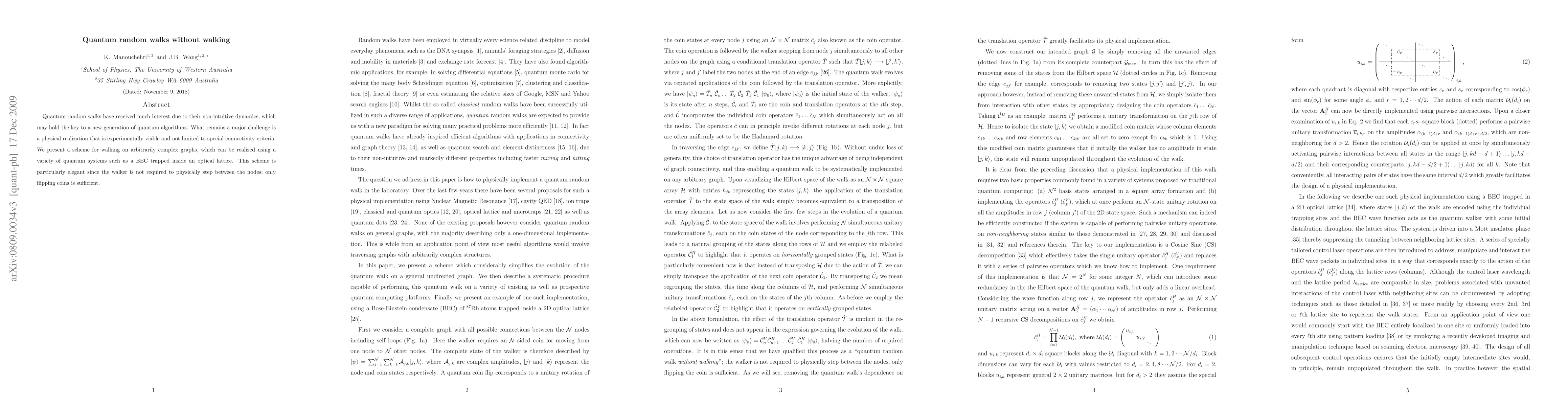 Quantum random walks have received much interest due to their non-intuitive dynamics, which may hold the key to a new generation of quantum algorithms. What remains a major challenge is a physical realization that is experimentally viable and not limited to special connectivity criteria. We present a scheme for walking on arbitrarily complex graphs, which can be realized using a variety of quantum systems such as a BEC trapped inside an optical lattice. This scheme is particularly elegant since the walker is not required to physically step between the nodes; only flipping coins is sufficient.