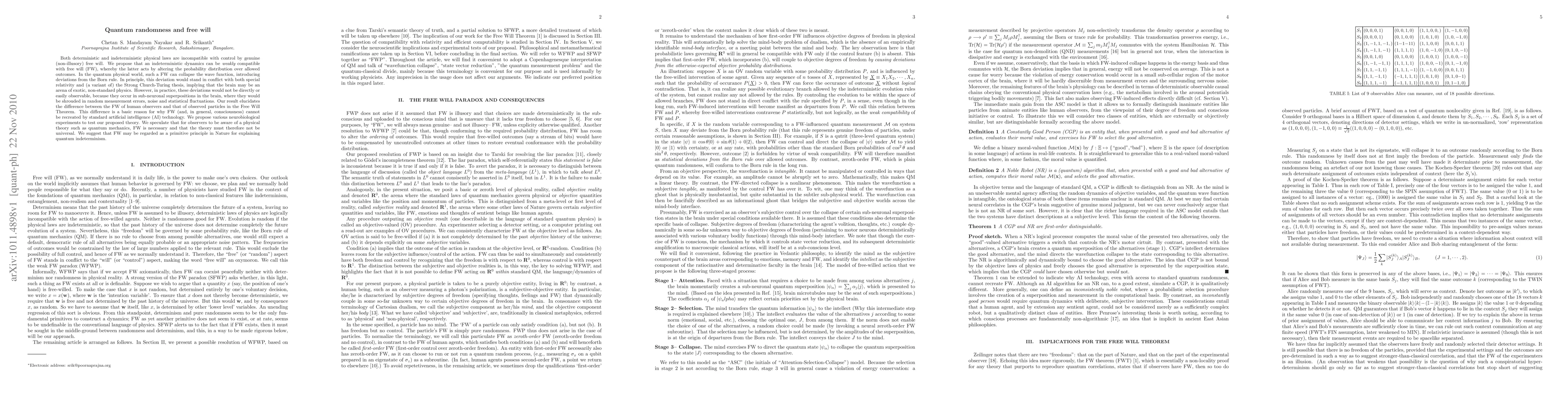 Both deterministic and indeterministic physical laws are incompatible with control by genuine (non-illusory) free will. We propose that an indeterministic dynamics can be $weakly$ compatible with free will (FW), whereby the latter acts by altering the probability distribution over allowed outcomes. In the quantum physical world, such a FW can collapse the wave function, introducing deviations from the Born rule. In principle, this deviation would stand in conflict with both special relativity and (a variant of) the Strong Church-Turing thesis, implying that the brain may be an arena of exotic, non-standard physics. However, in practice, these deviations would not be directly or easily observable, because they occur in sub-neuronal superpositions in the brain, where they would be shrouded in random measurement errors, noise and statistical fluctuations. Our result elucidates the difference between the FW of human observers and that of observed particles in the Free Will Theorem. This difference is a basic reason for why FW (and, in general, consciousness) cannot be recreated by standard artificial intelligence (AI) technology. We propose various neurobiological experiments to test our proposed theory. We speculate that for observers to be aware of a physical theory such as quantum mechanics, FW is necessary and that the theory must therefore not be universal. We suggest that FW may be regarded as a primitive principle in Nature for explaining quantum indeterminism.