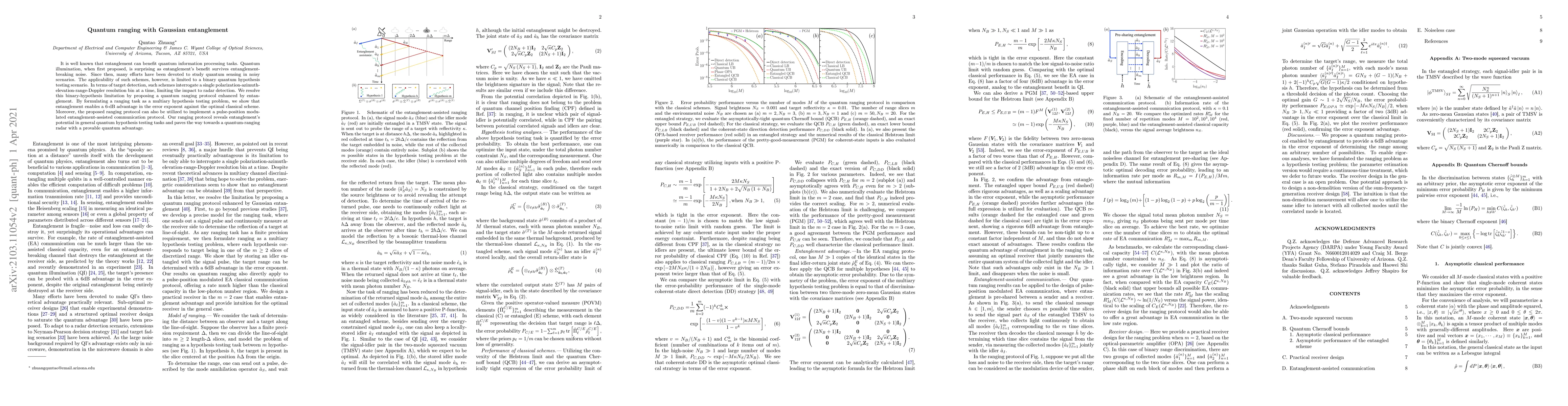 It is well known that entanglement can benefit quantum information processing tasks. Quantum illumination, when first proposed, is surprising as entanglement's benefit survives entanglement-breaking noise. Since then, many efforts have been devoted to study quantum sensing in noisy scenarios. The applicability of such schemes, however, is limited to a binary quantum hypothesis testing scenario. In terms of target detection, such schemes interrogate a single polarization-azimuth-elevation-range-Doppler resolution bin at a time, limiting the impact to radar detection. We resolve this binary-hypothesis limitation by proposing a quantum ranging protocol enhanced by entanglement. By formulating a ranging task as a multiary hypothesis testing problem, we show that entanglement enables a 6-dB advantage in the error exponent against the optimal classical scheme. Moreover, the proposed ranging protocol can also be utilized to implement a pulse-position modulated entanglement-assisted communication protocol. Our ranging protocol reveals entanglement's potential in general quantum hypothesis testing tasks and paves the way towards a quantum-ranging radar with a provable quantum advantage.