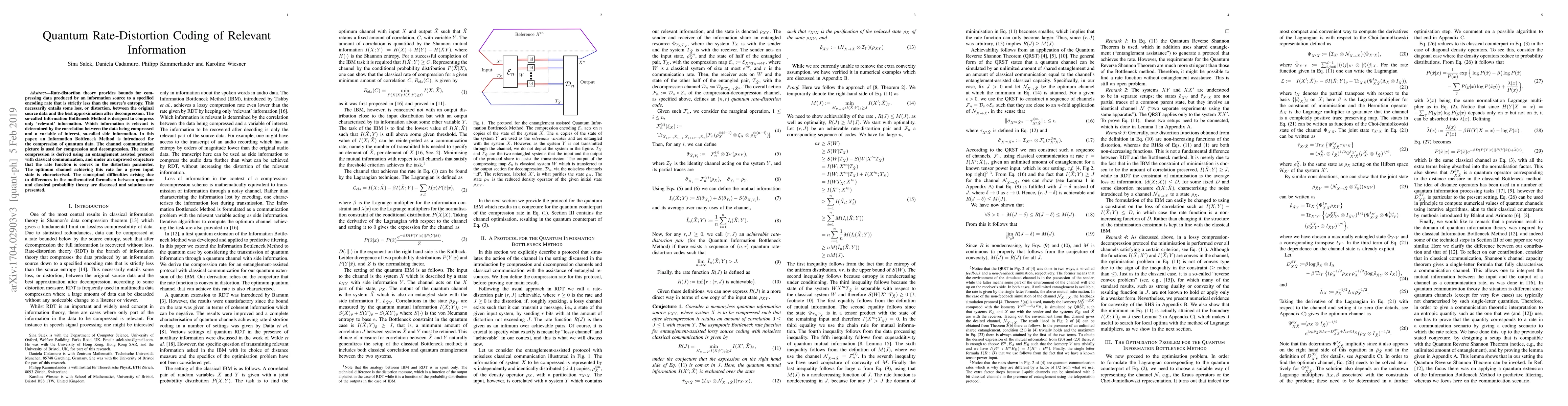 Rate-distortion theory provides bounds for compressing data produced by an information source to a specified encoding rate that is strictly less than the source's entropy. This necessarily entails some loss, or distortion, between the original source data and the best approximation after decompression. The so-called Information Bottleneck Method is designed to compress only `relevant' information. Which information is relevant is determined by the correlation between the data being compressed and a variable of interest, so-called side information. In this paper, an Information Bottleneck Method is introduced for the compression of quantum data. The channel communication picture is used for compression and decompression. The rate of compression is derived using an entanglement assisted protocol with classical communication, and under an unproved conjecture that the rate function is convex in the distortion parameter. The optimum channel achieving this rate for a given input state is characterised. The conceptual difficulties arising due to differences in the mathematical formalism between quantum and classical probability theory are discussed and solutions are presented.