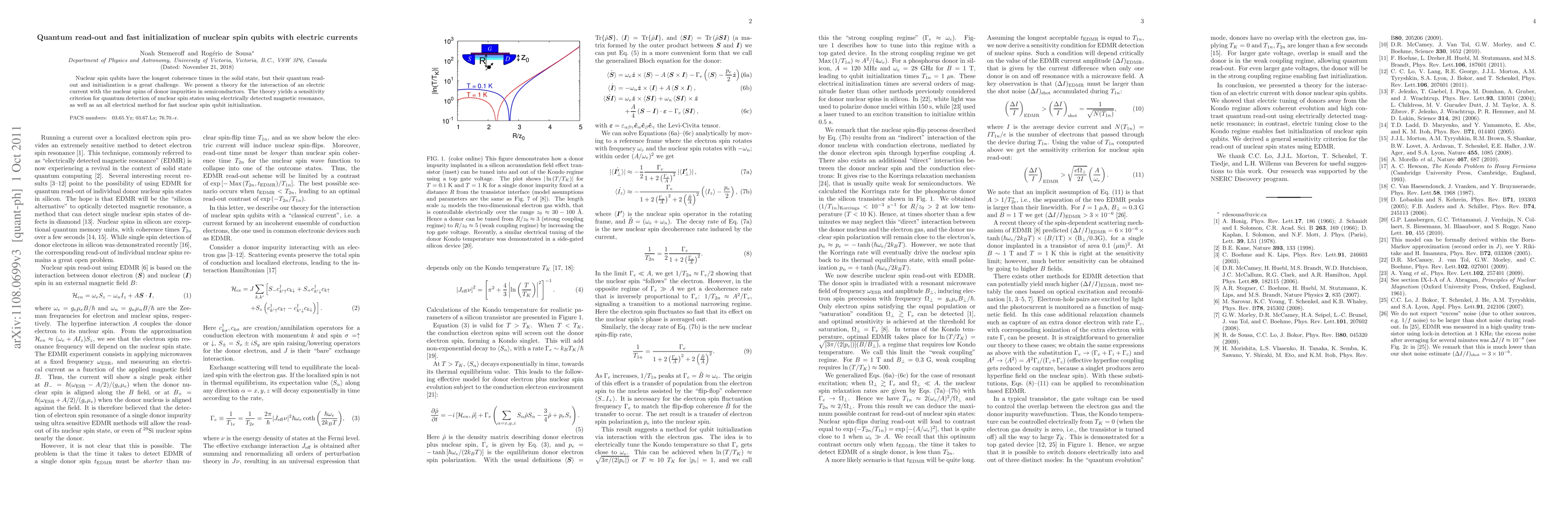 This paper presents a theoretical framework for utilizing electric currents to read out and quickly initialize nuclear spin qubits in semiconductors, offering a sensitivity criterion for quantum detection and an all-electrical method for qubit initialization.