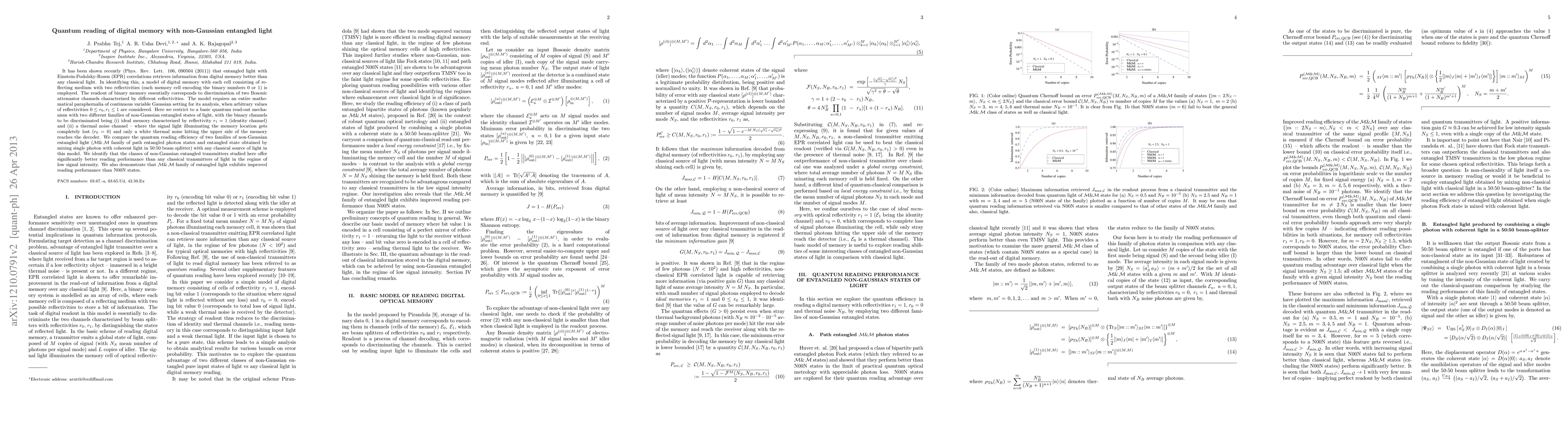 It has been shown recently (Phys. Rev. Lett. 106, 090504 (2011)) that entangled light with Einstein-Podolsky-Rosen (EPR) correlations retrieves information from digital memory better than any classical light. In identifying this, a model of digital memory with each cell consisting of reflecting medium with two reflectivities (each memory cell encoding the binary numbers 0 or 1) is employed. The readout of binary memory essentially corresponds to discrimination of two Bosonic attenuator channels characterized by different reflectivities. The model requires an entire mathematical paraphernalia of continuous variable Gaussian setting for its analysis, when arbitrary values of reflectivities are considered. Here we restrict to a basic quantum read-out mechanism with non-Gaussian entangled states of light, with the binary channels to be discriminated being ideal memory characterized by reflectivity one i.e., an identity channel and thermal noise channel, where the signal light illuminating the memory location gets completely lost (zero reflectivity) and only a white thermal noise hitting the upper side of the memory reaches the decoder. We compare the quantum reading efficiency of entangled light with any classical source of light in this model. We show that entangled transmitters offer better reading performance than any classical transmitters of light in the regime of low signal intensity.