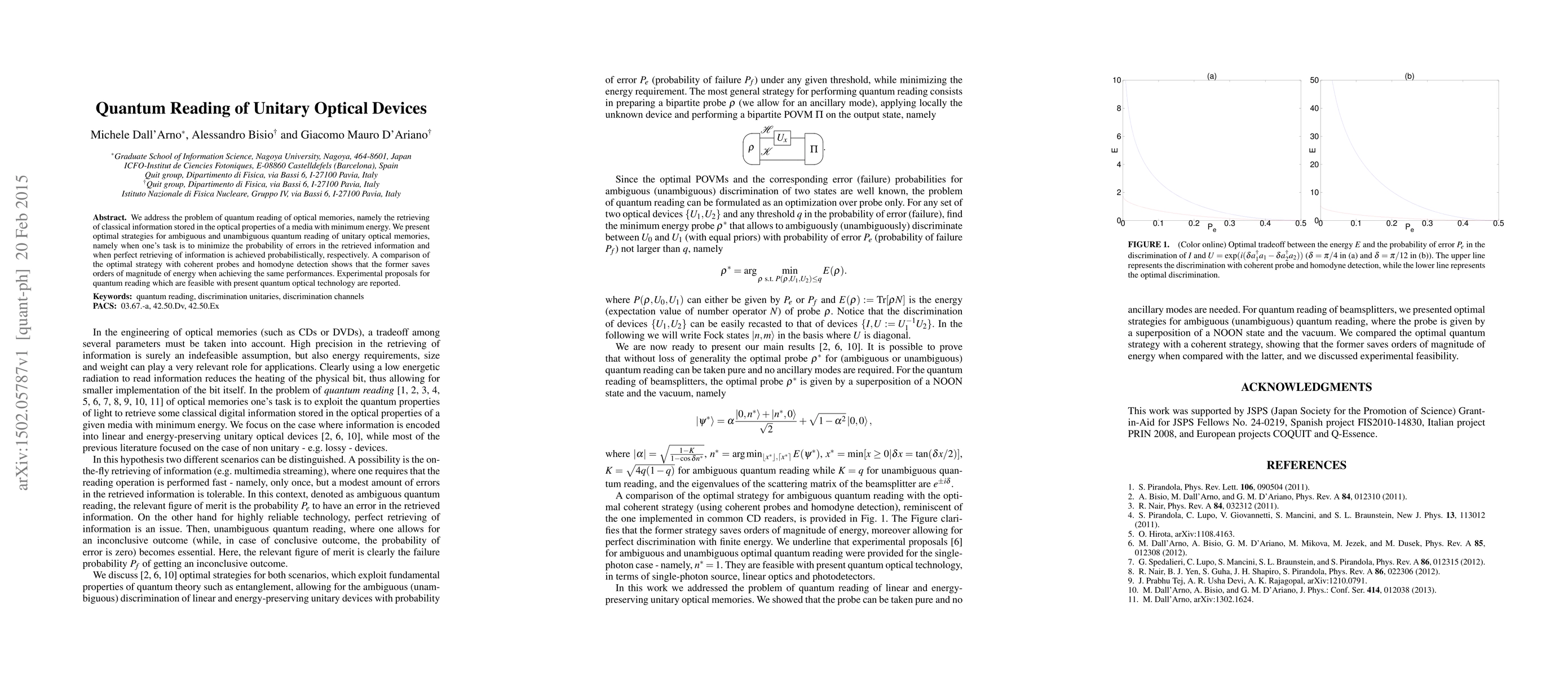 We address the problem of quantum reading of optical memories, namely the retrieving of classical information stored in the optical properties of a media with minimum energy. We present optimal strategies for ambiguous and unambiguous quantum reading of unitary optical memories, namely when one's task is to minimize the probability of errors in the retrieved information and when perfect retrieving of information is achieved probabilistically, respectively. A comparison of the optimal strategy with coherent probes and homodyne detection shows that the former saves orders of magnitude of energy when achieving the same performances. Experimental proposals for quantum reading which are feasible with present quantum optical technology are reported.