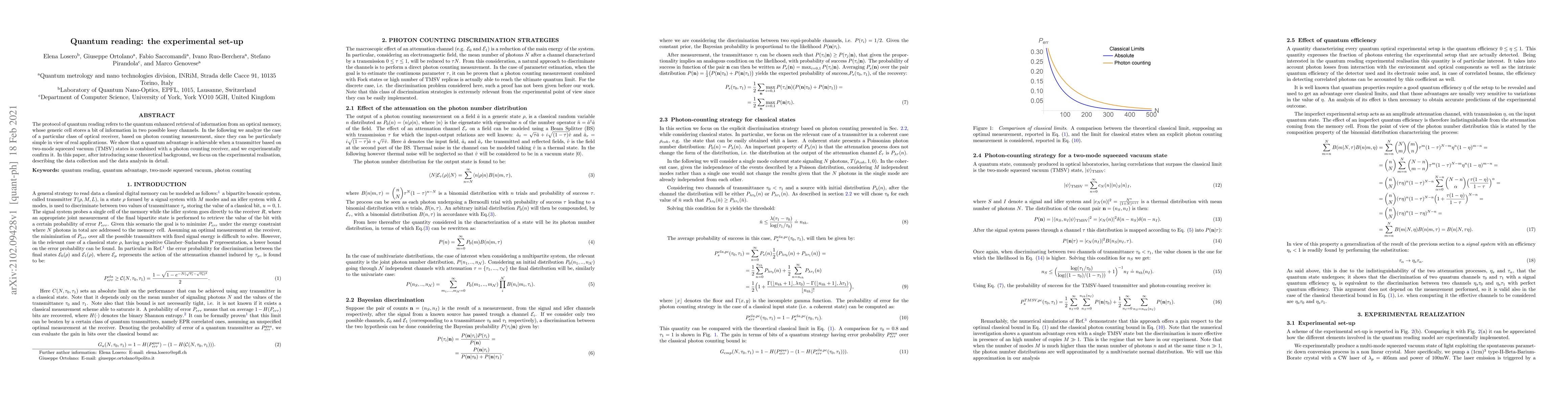 The protocol of quantum reading refers to the quantum enhanced retrieval of information from an optical memory, whose generic cell stores a bit of information in two possible lossy channels. In the following we analyze the case of a particular class of optical receiver, based on photon counting measurement, since they can be particularly simple in view of real applications. We show that a quantum advantage is achievable when a transmitter based on two-mode squeezed vacuum (TMSV) states is combined with a photon counting receiver, and we experimentally confirm it. In this paper, after introducing some theoretical background, we focus on the experimental realisation, describing the data collection and the data analysis in detail.