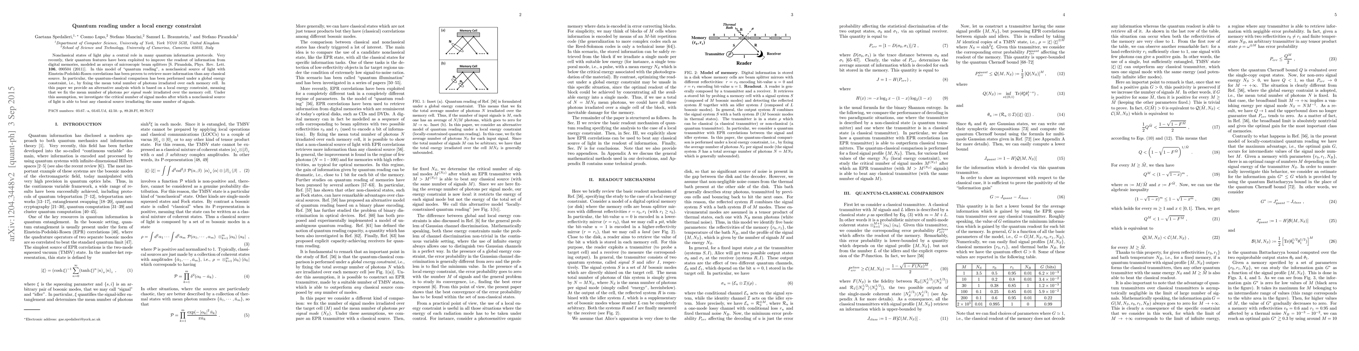 Nonclassical states of light play a central role in many quantum information protocols. Their quantum features have been exploited to improve the readout of information from digital memories, modelled as arrays of microscopic beam splitters [S. Pirandola, Phys. Rev. Lett. 106, 090504 (2011)]. In this model of quantum reading, a nonclassical source of light with Einstein-Podolski-Rosen correlations has been proven to retrieve more information than any classical source. In particular, the quantum-classical comparison has been performed under a global energy constraint, i.e., by fixing the mean total number of photons irradiated over each memory cell. In this paper we provide an alternative analysis which is based on a local energy constraint, meaning that we fix the mean number of photons per signal mode irradiated over the memory cell. Under this assumption, we investigate the critical number of signal modes after which a nonclassical source of light is able to beat any classical source irradiating the same number of signals.