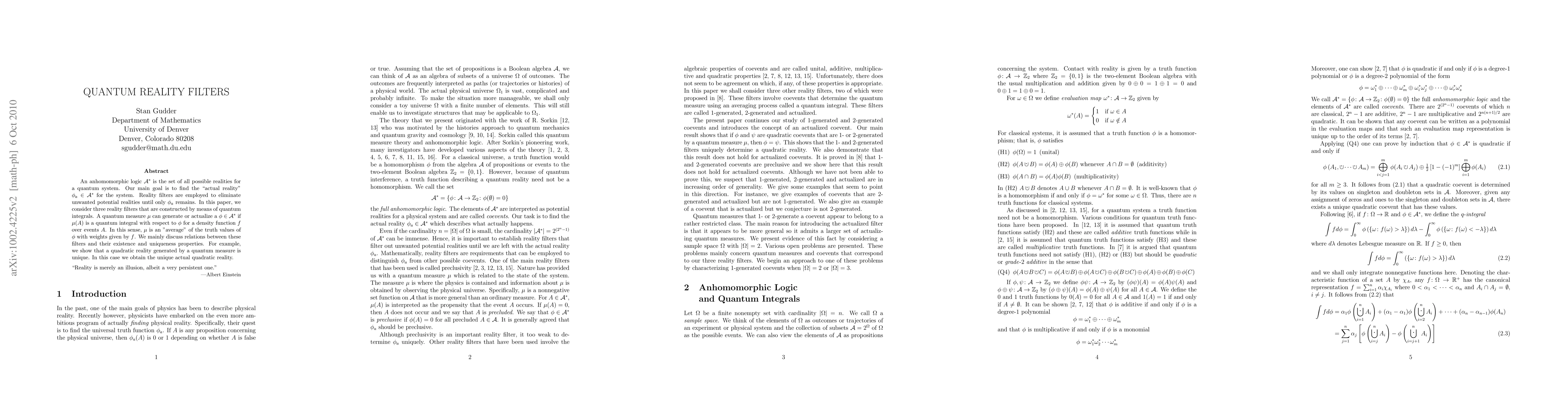 This paper explores an anhomomorphic logic framework to determine the "actual reality" for quantum systems by employing reality filters. It investigates three filters constructed via quantum integrals, demonstrating the uniqueness of a quadratic reality generated by a quantum measure.