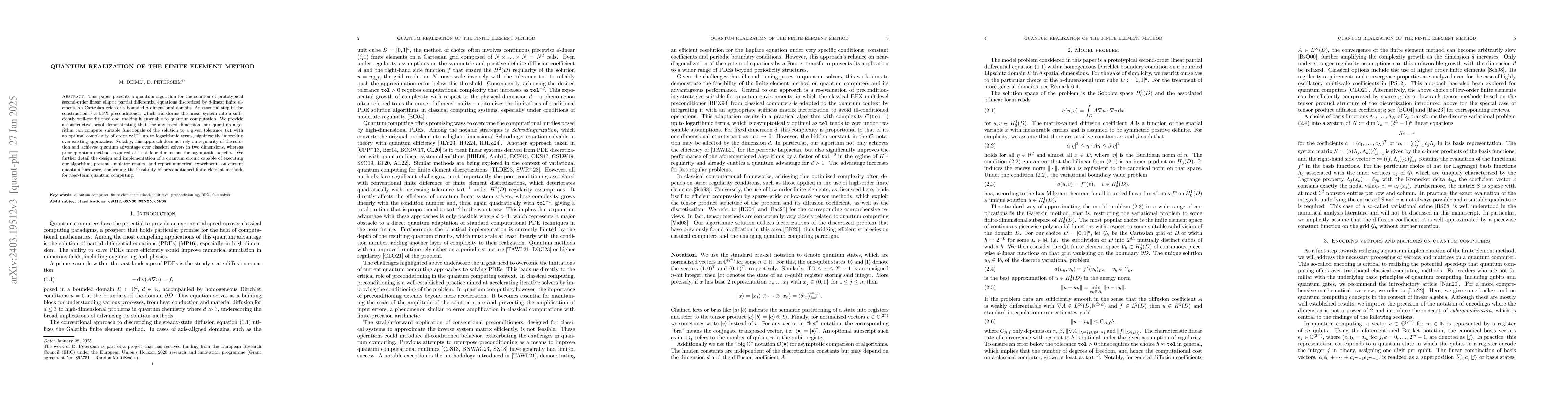 This paper presents a quantum algorithm for the solution of prototypical second-order linear elliptic partial differential equations discretized by $d$-linear finite elements on Cartesian grids of a bounded $d$-dimensional domain. An essential step in the construction is a BPX preconditioner, which transforms the linear system into a sufficiently well-conditioned one, making it amenable to quantum computation. We provide a constructive proof demonstrating that our quantum algorithm can compute suitable functionals of the solution to a given tolerance $\texttt{tol}$ with a complexity linear in $\texttt{tol}^{-1}$ for a fixed dimension $d$, neglecting logarithmic terms. This complexity is proportional to that of its one-dimensional counterpart and improves previous quantum algorithms by a factor of order $\texttt{tol}^{-2}$. We also detail the design and implementation of a quantum circuit capable of executing our algorithm, and present simulator results that support the quantum feasibility of the finite element method in the near future, paving the way for quantum computing approaches to a wide range of PDE-related challenges.