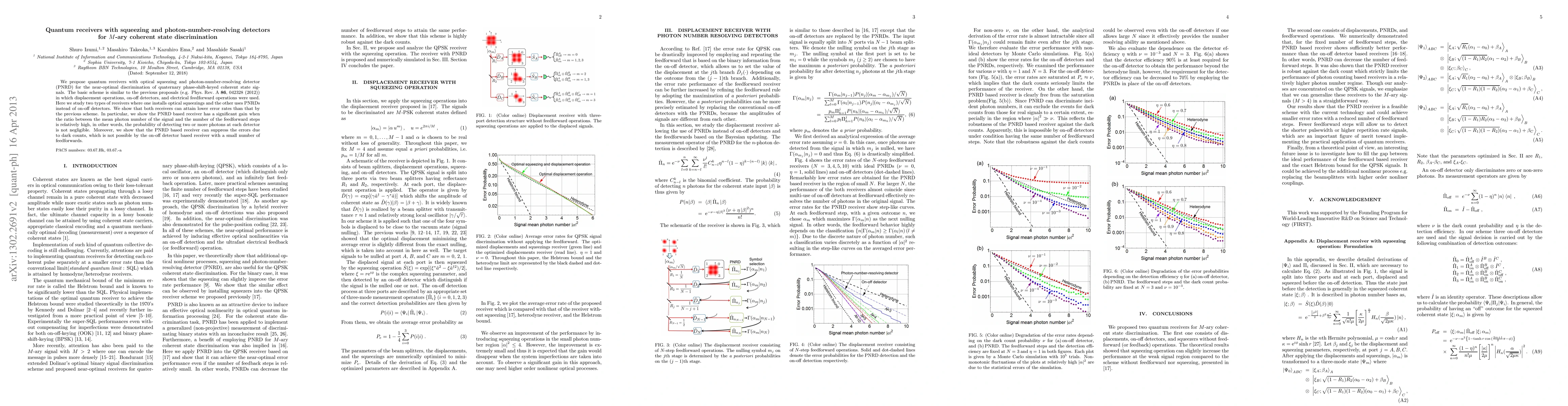This paper proposes quantum receivers utilizing optical squeezing and photon-number-resolving detectors (PNRD) for improved discrimination of quaternary phase-shift-keyed signals. The PNRD-based receiver demonstrates lower error rates and error suppression due to dark counts compared to previous schemes using on-off detectors.