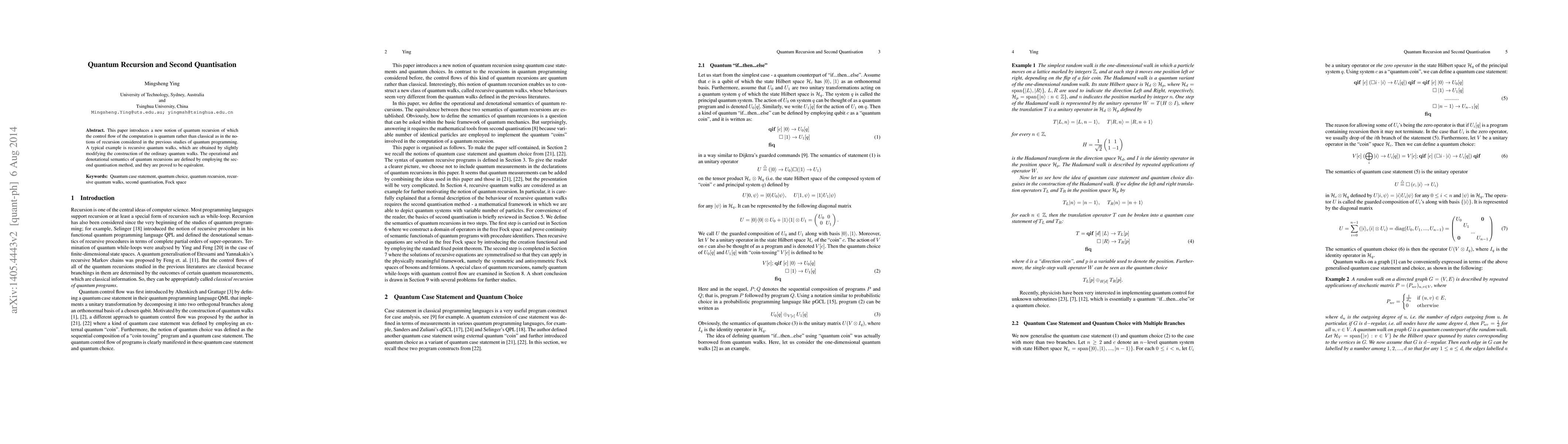 This paper proposes quantum recursion where computation control is quantum rather than classical, exemplified by recursive quantum walks. It employs second quantization to define and prove the equivalence of operational and denotational semantics for quantum recursions.