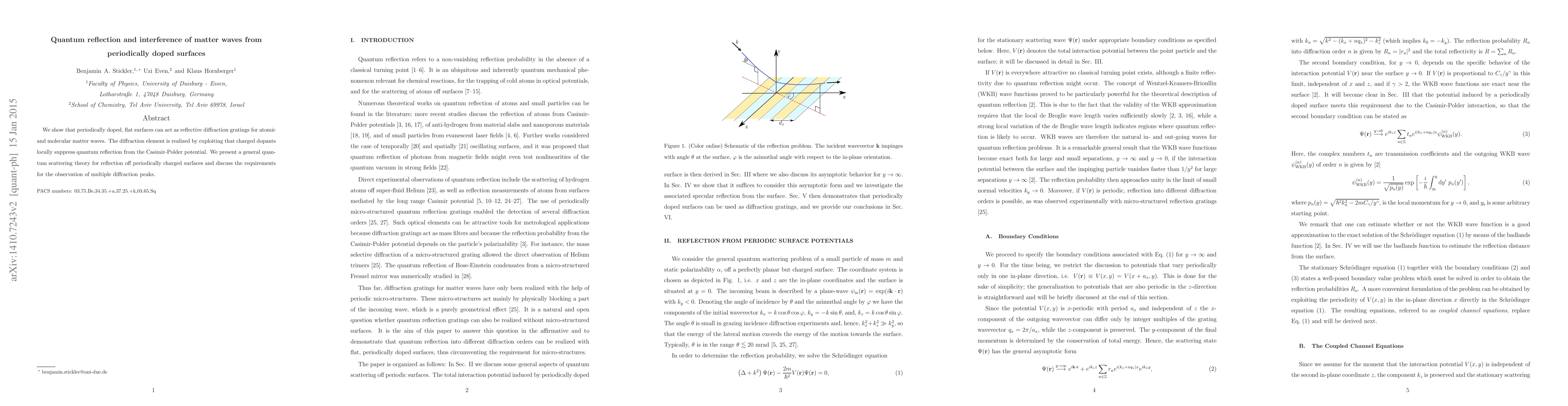We show that periodically doped, flat surfaces can act as reflective diffraction gratings for atomic and molecular matter waves. The diffraction element is realized by exploiting that charged dopants locally suppress quantum reflection from the Casimir-Polder potential. We present a general quantum scattering theory for reflection off periodically charged surfaces and discuss the requirements for the observation of multiple diffraction peaks.