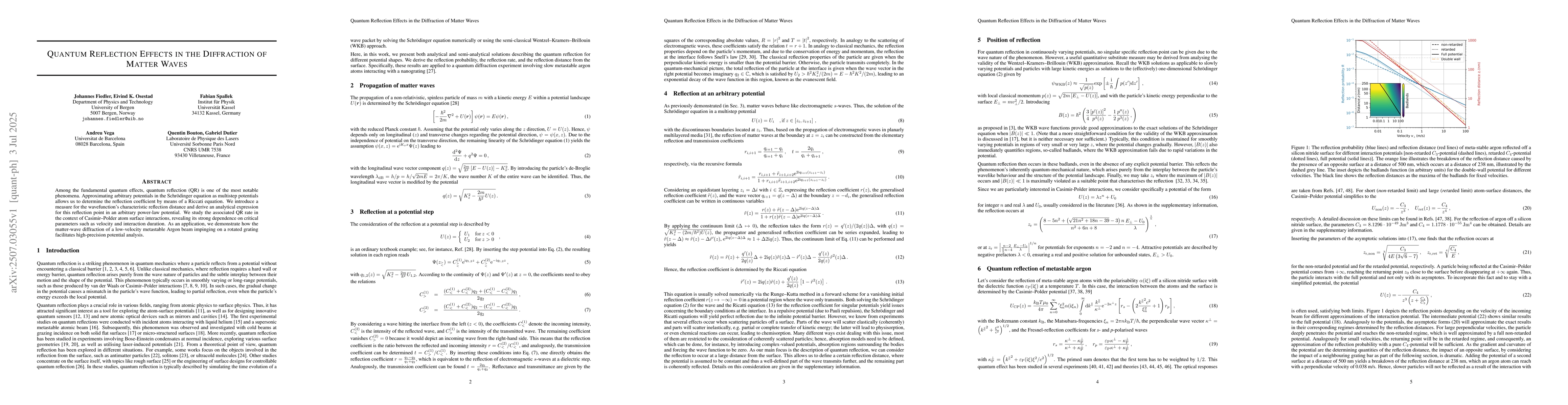Among the fundamental quantum effects, quantum reflection (QR) is one of the most notable phenomena. Approximating arbitrary potentials in the Schr\"odinger equation as multistep potentials allows us to determine the reflection coefficient by means of a Riccati equation. We introduce a measure for the wavefunction's characteristic reflection distance and derive an analytical expression for this reflection point in an arbitrary power-law potential. We study the associated QR rate in the context of Casimir--Polder atom surface interactions, revealing its strong dependence on critical parameters such as velocity and interaction duration. As an application, we demonstrate how the matter-wave diffraction of a low-velocity metastable Argon beam impinging on a rotated grating facilitates high-precision potential analysis.