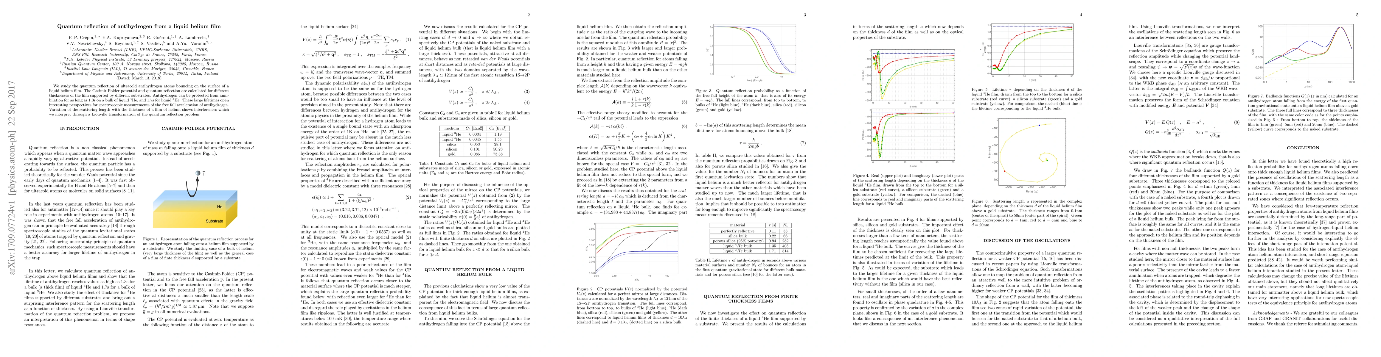 This study investigates the quantum reflection of ultracold antihydrogen atoms on liquid helium films, revealing that antihydrogen can be preserved from annihilation for up to 1.7 seconds on liquid helium. The research provides insights into spectroscopic measurements of antihydrogen's free fall acceleration and explores interference effects due to varying film thicknesses.