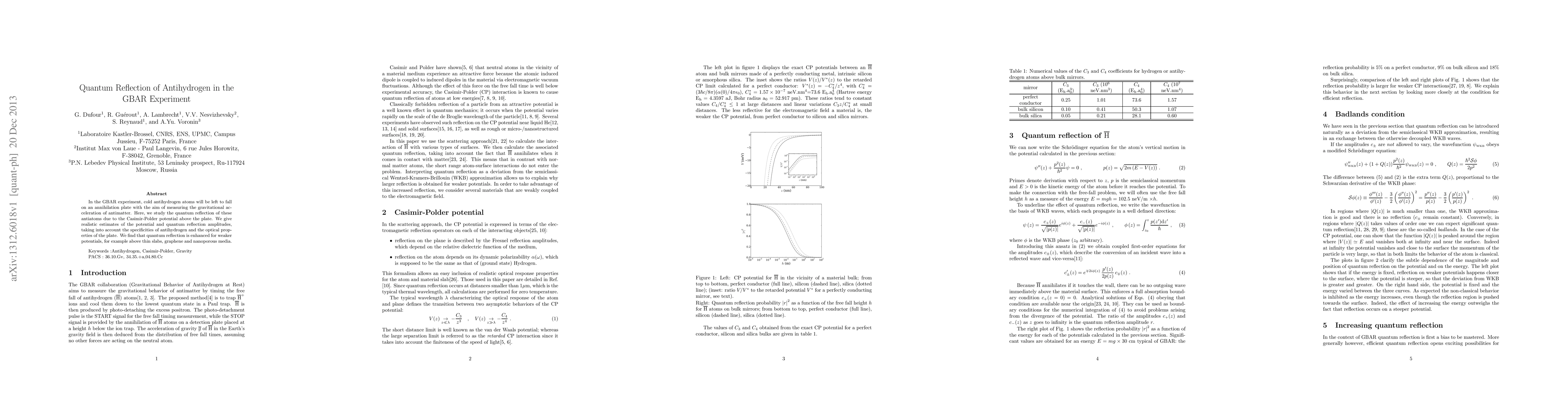 The GBAR experiment investigates the quantum reflection of antihydrogen atoms due to the Casimir-Polder potential above an annihilation plate, providing realistic estimates of potential and reflection amplitudes. Quantum reflection is found to be enhanced for weaker potentials, particularly above thin materials like graphene and nanoporous media.