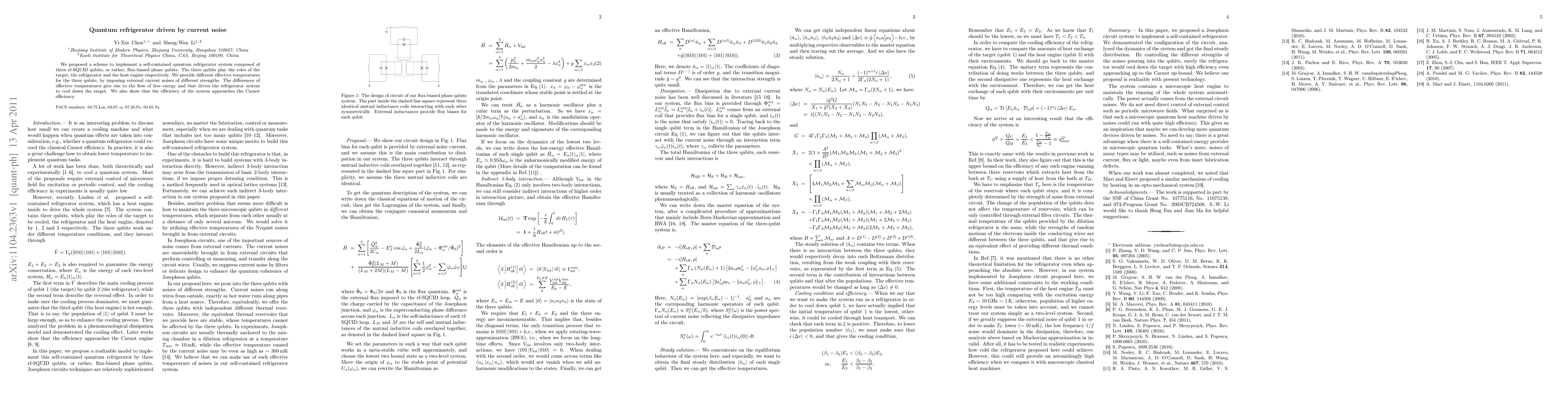 This paper proposes a quantum refrigerator using three rf-SQUID qubits, where external current noise creates different effective temperatures, driving the system to cool the target and achieving near-Carnot efficiency. The setup demonstrates a self-contained refrigeration mechanism based on quantum principles.