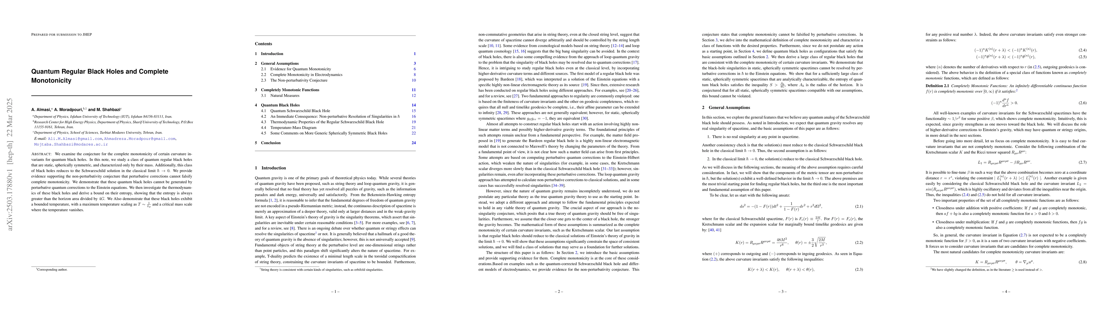 The paper examines quantum regular black holes through the lens of complete monotonicity, focusing on static, spherically symmetric solutions characterized by mass. It explores perturbative corrections to the Einstein equations and their impact on the non-perturbative nature of these black holes.