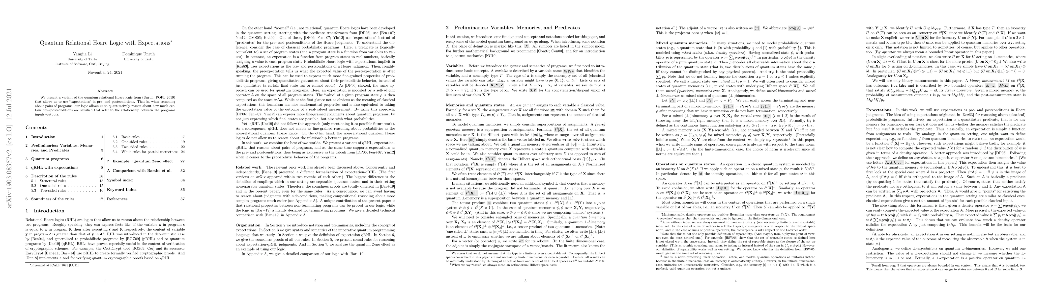 We present a variant of the quantum relational Hoare logic from (Unruh, POPL 2019) that allows us to use "expectations" in pre- and postconditions. That is, when reasoning about pairs of programs, our logic allows us to quantitatively reason about how much certain pre-/postconditions are satisfied that refer to the relationship between the programs inputs/outputs.