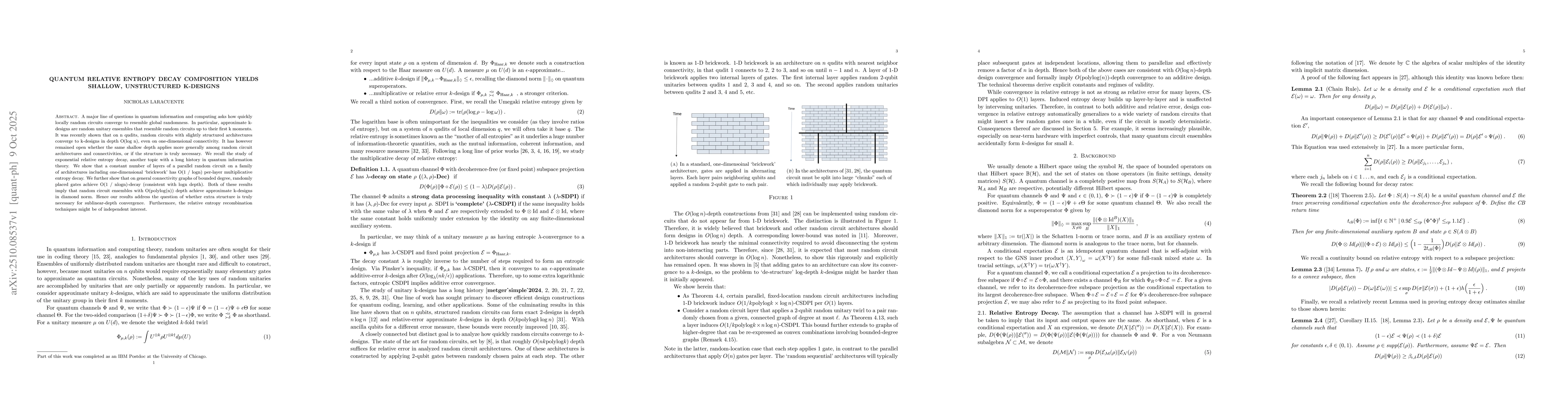 A major line of questions in quantum information and computing asks how quickly locally random circuits converge to resemble global randomness. In particular, approximate k-designs are random unitary ensembles that resemble random circuits up to their first k moments. It was recently shown that on n qudits, random circuits with slightly structured architectures converge to k-designs in depth O(log n), even on one-dimensional connectivity. It has however remained open whether the same shallow depth applies more generally among random circuit architectures and connectivities, or if the structure is truly necessary. We recall the study of exponential relative entropy decay, another topic with a long history in quantum information theory. We show that a constant number of layers of a parallel random circuit on a family of architectures including one-dimensional `brickwork' has O(1 / logn) per-layer multiplicative entropy decay. We further show that on general connectivity graphs of bounded degree, randomly placed gates achieve O(1 / nlogn)-decay (consistent with logn depth). Both of these results imply that random circuit ensembles with O(polylog(n)) depth achieve approximate k-designs in diamond norm. Hence our results address the question of whether extra structure is truly necessary for sublinear-depth convergence. Furthermore, the relative entropy recombination techniques might be of independent interest.