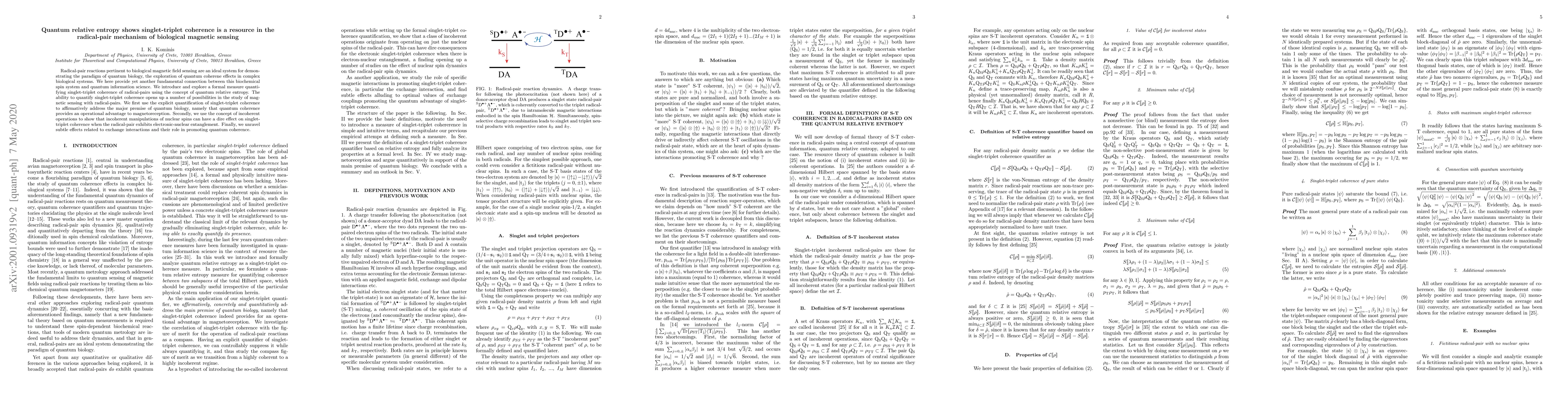 This paper introduces quantum relative entropy to quantify singlet-triplet coherence in radical-pair reactions, demonstrating that quantum coherence is a resource in biological magnetic sensing. It affirms the operational advantage of quantum coherence in magnetoreception and explores the impact of incoherent nuclear spin manipulations on coherence.