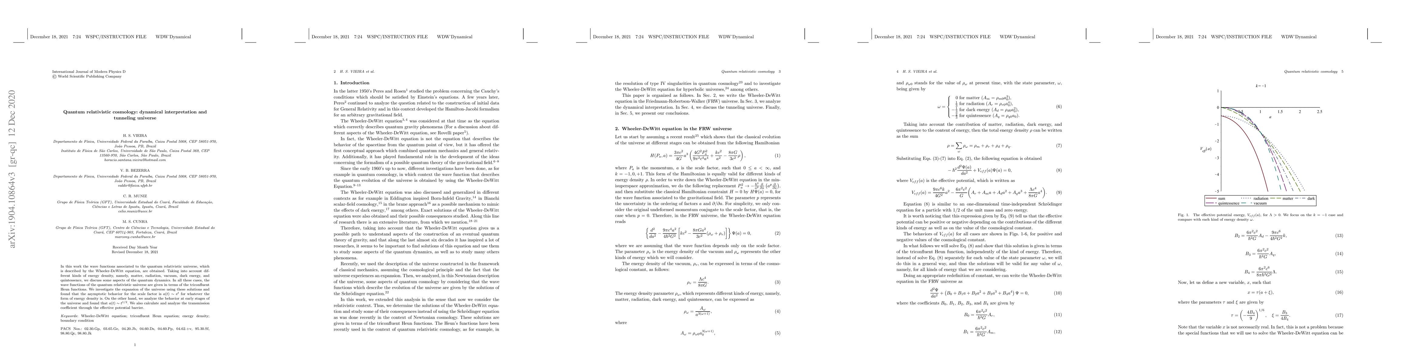 In this work the wave functions associated to the quantum relativistic universe, which is described by the Wheeler-DeWitt equation, are obtained. Taking into account different kinds of energy density, namely, matter, radiation, vacuum, dark energy, and quintessence, we discuss some aspects of the quantum dynamics. In all these cases, the wave functions of the quantum relativistic universe are given in terms of the triconfluent Heun functions. We investigate the expansion of the universe using these solutions and found that the asymptotic behavior for the scale factor is $a(t) \sim \mbox{e}^{t}$ for whatever the form of energy density is. On the other hand, we analyze the behavior at early stages of the universe and found that $a(t) \sim t^{1/2}$. We also calculate and analyze the transmission coefficient through the effective potential barrier.