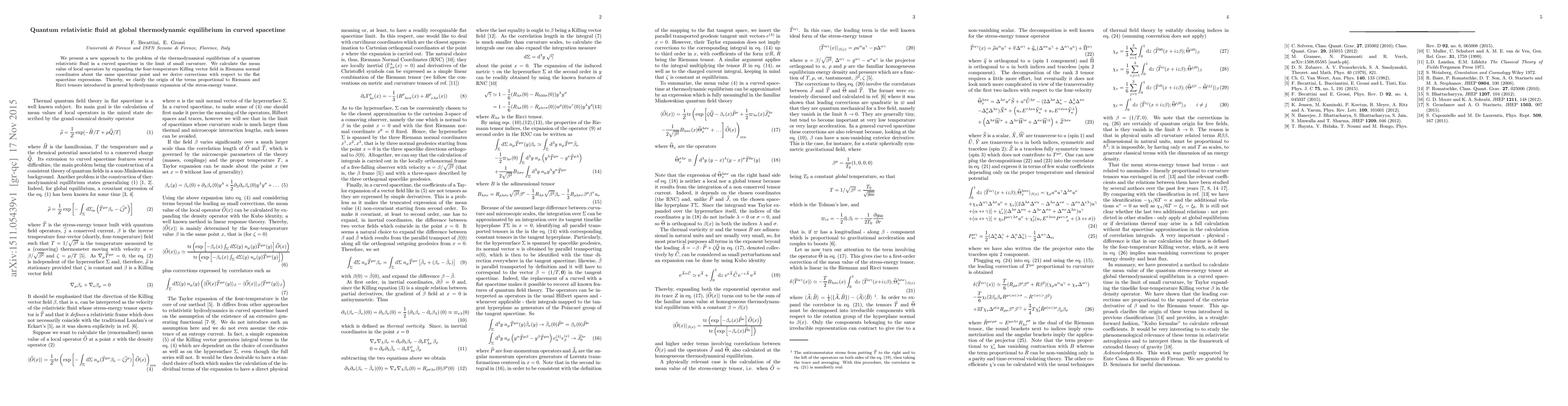 This paper introduces a novel method to determine the thermodynamic equilibrium of a quantum relativistic fluid in curved spacetime, deriving corrections to flat spacetime expressions by expanding the four-temperature Killing vector field in Riemann normal coordinates, and clarifying the origin of the Riemann and Ricci tensor terms in hydrodynamic expansion.