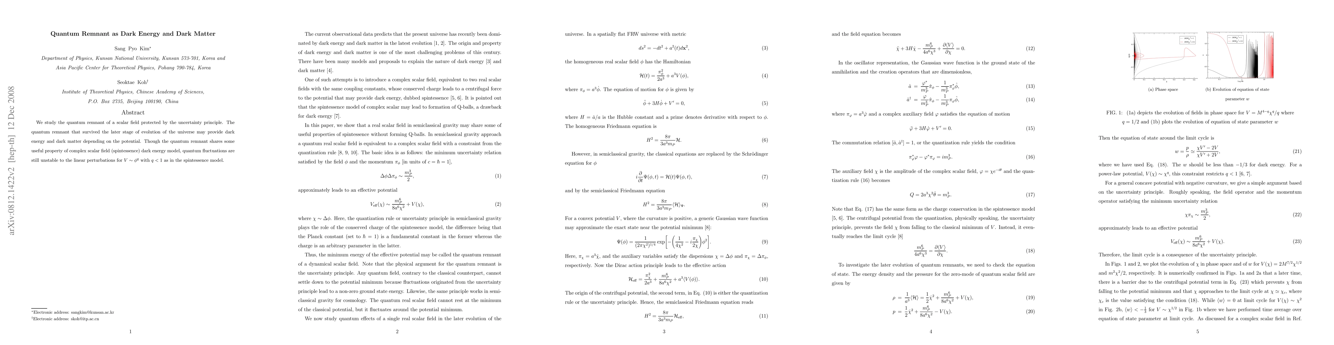 We study the quantum remnant of a scalar field protected by the uncertainty principle. The quantum remnant that survived the later stage of evolution of the universe may provide dark energy and dark matter depending on the potential. Though the quantum remnant shares some useful property of complex scalar field (spintessence) dark energy model, % However although it avoids the formation of Q-ball, quantum fluctuations are still unstable to the linear perturbations for $V \sim \phi^q$ with $q<1$ as in the spintessence model.