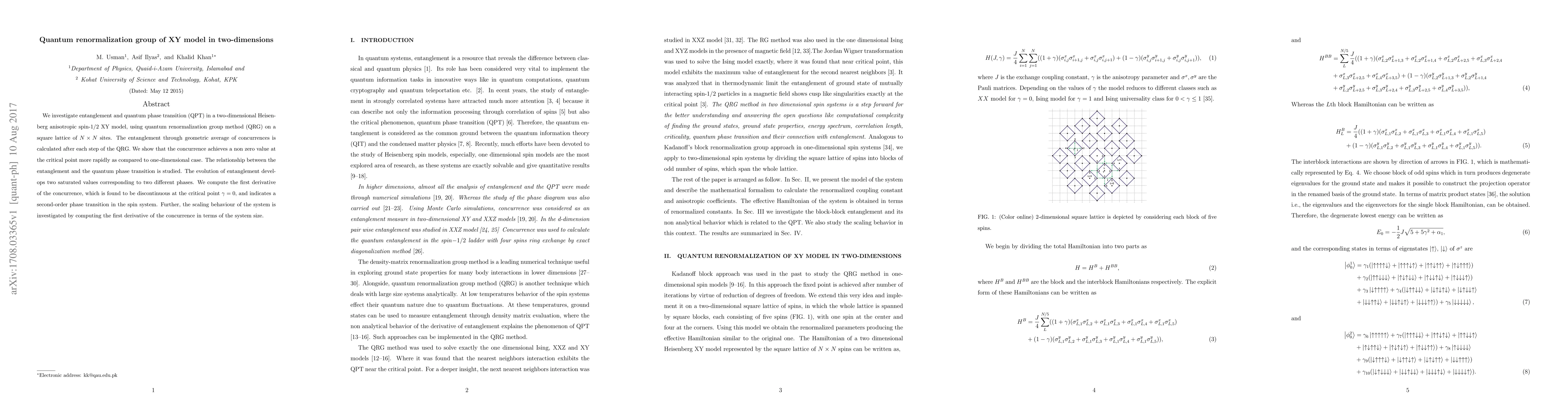 This paper explores entanglement and quantum phase transitions in a two-dimensional XY model using quantum renormalization group methods, finding that entanglement grows more rapidly at the critical point compared to one-dimensional systems, and identifies a second-order phase transition at $\gamma=0$ through the discontinuity in the first derivative of concurrence.