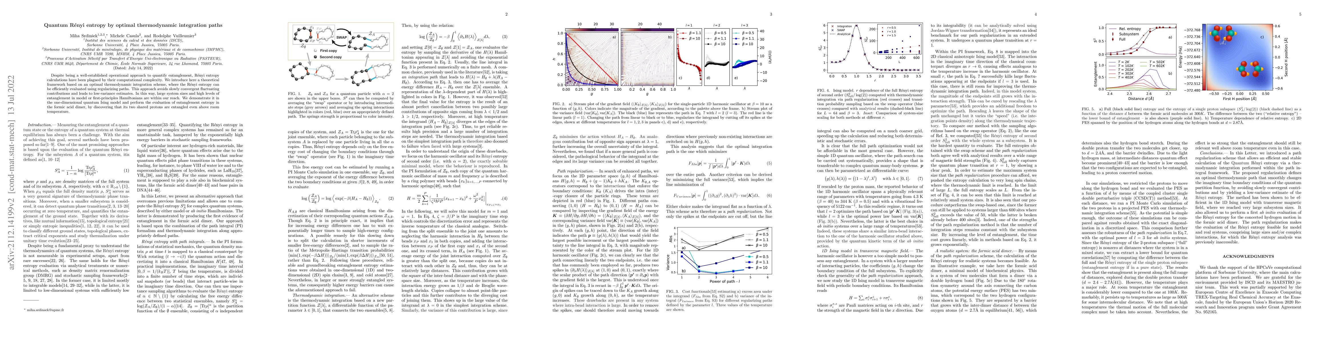Despite being a well-established operational approach to quantify entanglement, R\'enyi entropy calculations have been plagued by their computational complexity. We introduce here a theoretical framework based on an optimal thermodynamic integration scheme, where the R\'enyi entropy can be efficiently evaluated using regularizing paths. This approach avoids slowly convergent fluctuating contributions and leads to low-variance estimates. In this way, large system sizes and high levels of entanglement in model or first-principles Hamiltonians are within our reach. We demonstrate it in the one-dimensional quantum Ising model and perform the evaluation of entanglement entropy in the formic acid dimer, by discovering that its two shared protons are entangled even above room temperature.