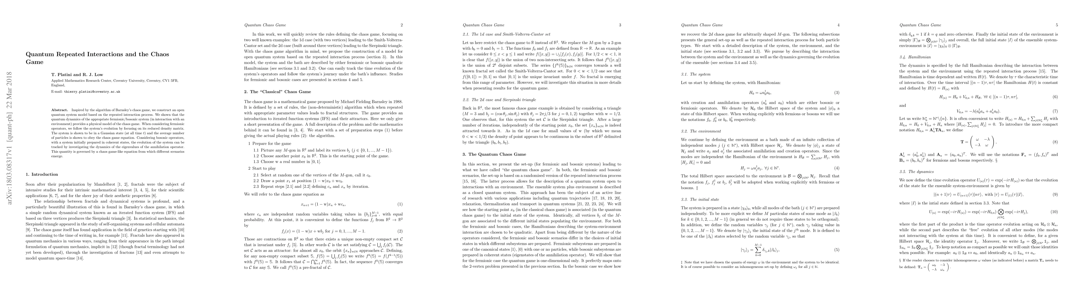 This paper constructs a quantum system model based on repeated interactions, demonstrating that its dynamics mimics Barnsley's chaos game. For fermionic systems, the evolution is tracked via the reduced density matrix, showing Gaussian states and particle number dynamics governed by the chaos game equation. For bosonic systems, coherent states' annihilation operator dynamics follow a chaos game-like equation, revealing diverse emergent scenarios.