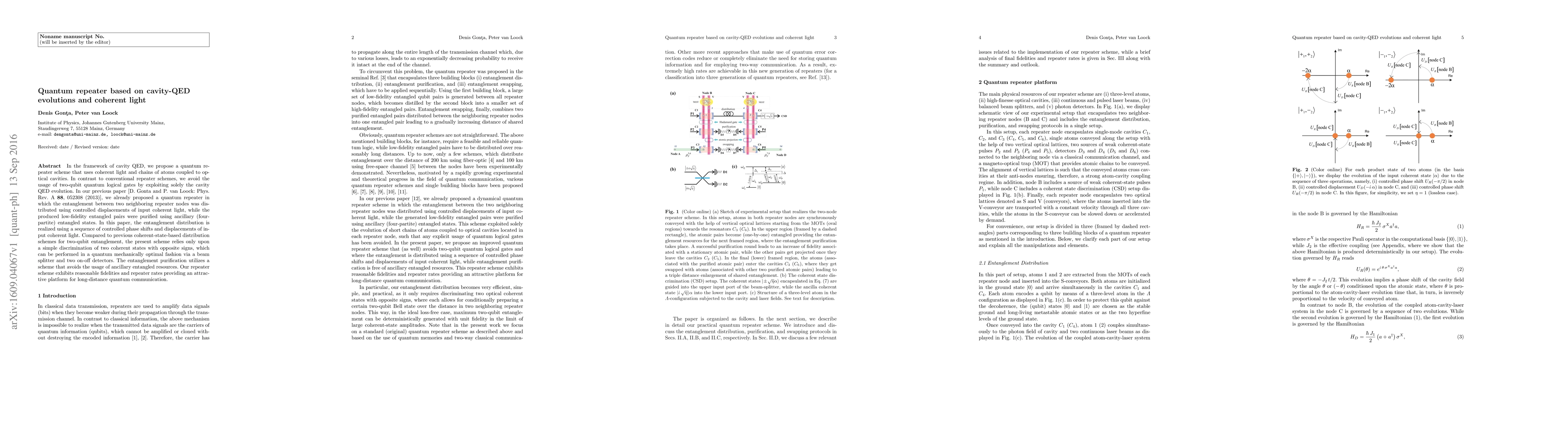 This paper proposes a quantum repeater scheme based on cavity QED, utilizing coherent light and atomic chains in optical cavities to distribute entanglement through controlled phase shifts and displacements. Unlike conventional methods, it avoids two-qubit gates and ancillary entangled states, offering a simpler, more efficient approach for long-distance quantum communication.