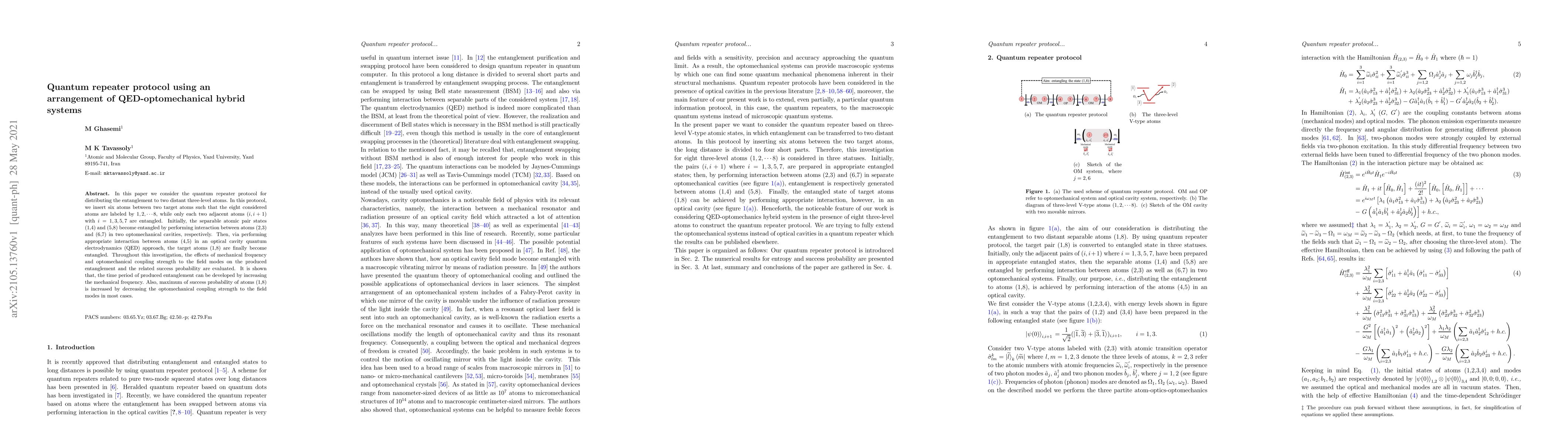 This paper proposes a quantum repeater protocol using QED-optomechanical hybrid systems to distribute entanglement between distant three-level atoms. The protocol involves entanglement between specific pairs of atoms and evaluates the impact of mechanical frequency and optomechanical coupling on entanglement success probability.