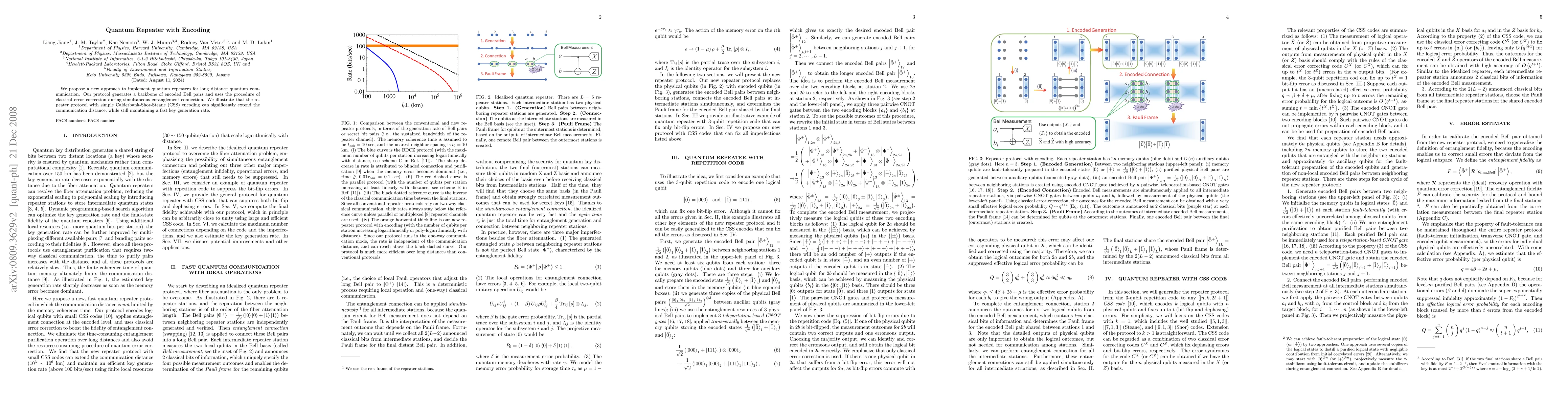 This paper proposes a novel quantum repeater protocol that uses encoded Bell pairs and classical error correction to extend the distance of quantum communication. The implementation with CSS encoding maintains a high key generation rate, enhancing long-distance quantum communication efficiency.