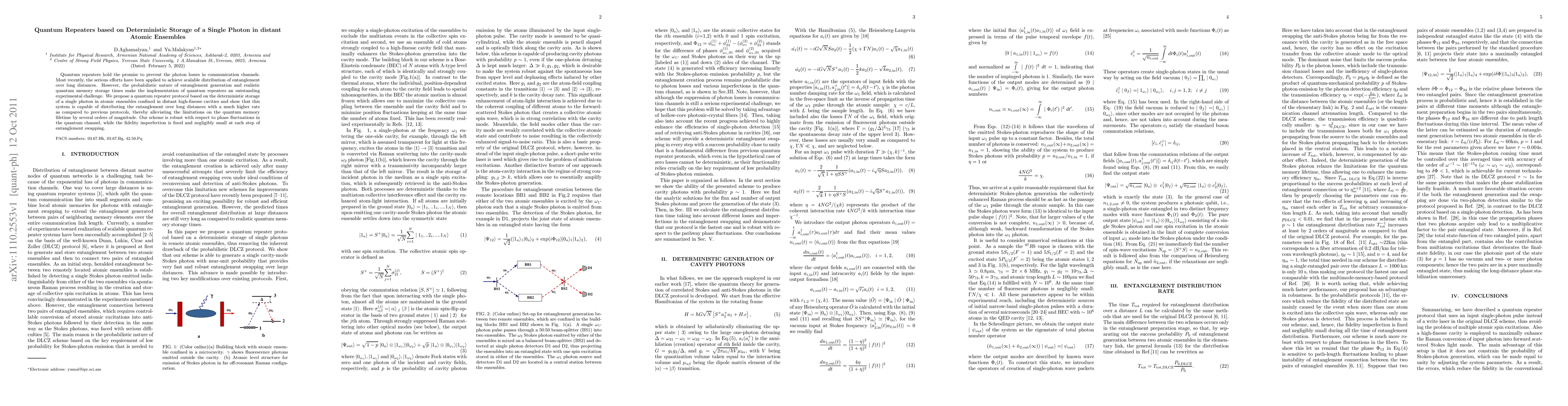 This paper proposes a quantum repeater protocol utilizing deterministic storage of single photons in distant atomic ensembles, significantly improving the rate of long-distance entanglement distribution compared to previous methods. The scheme effectively mitigates photon loss and phase fluctuation issues, maintaining high fidelity throughout the process.